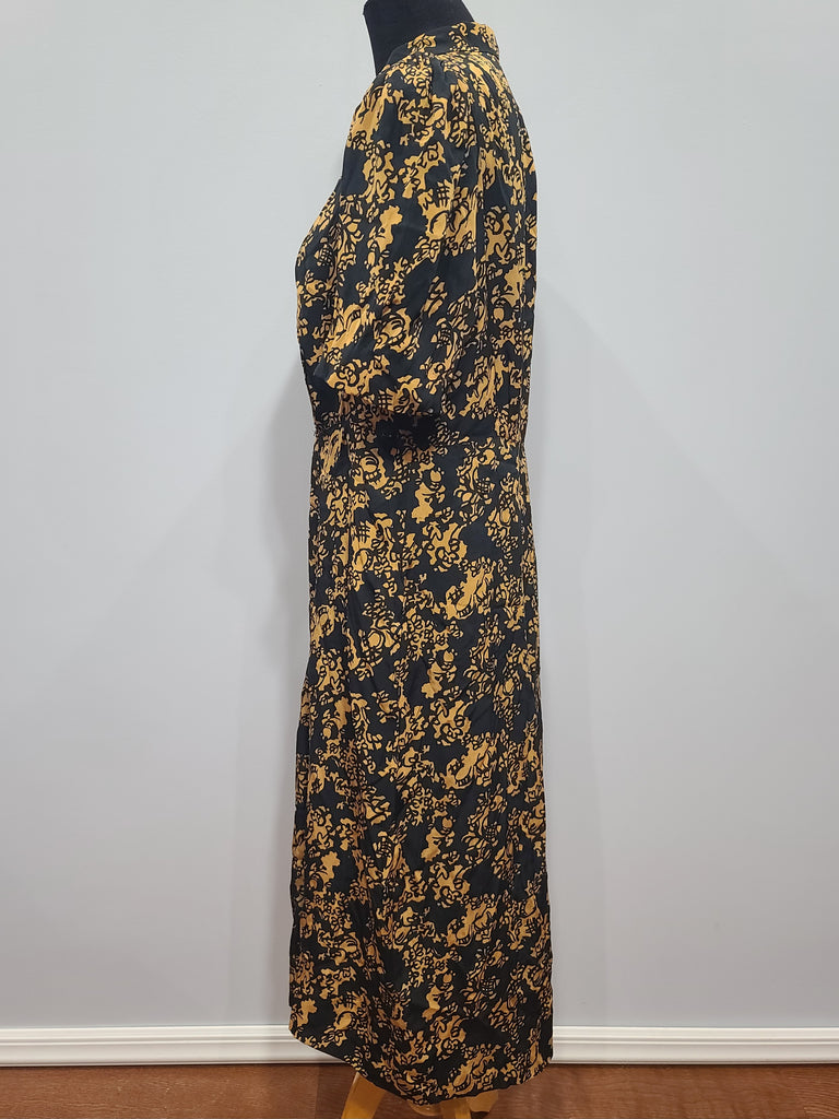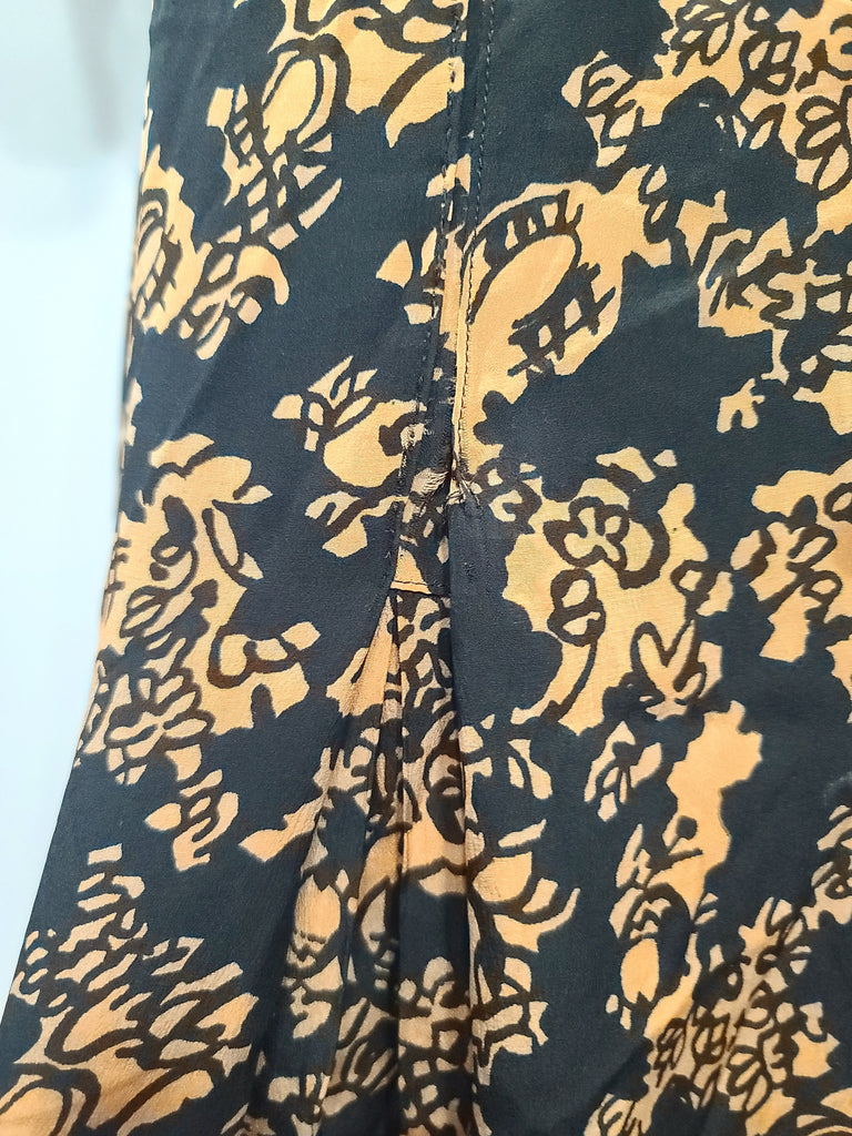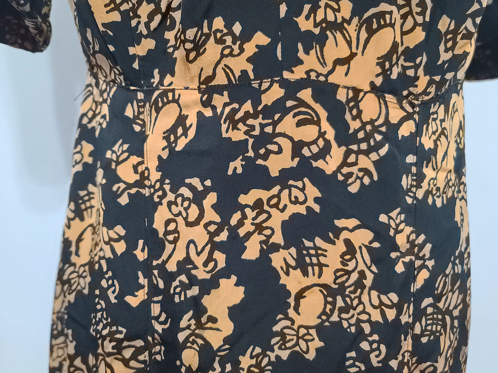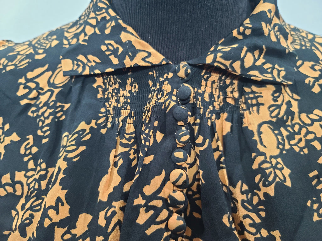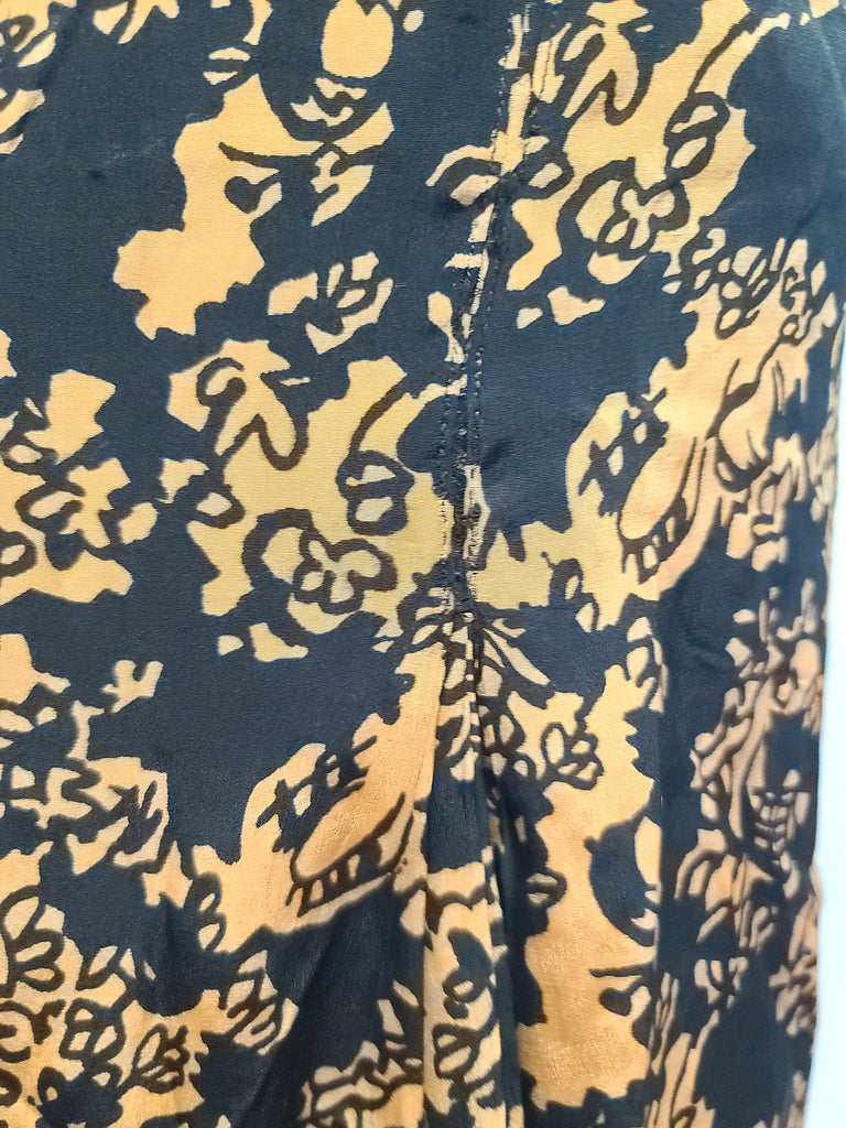Handmade dress. Black with a dark yellow/orange/gold color. More flattering than the 1920s flapper style, but it still has some elements of a looser fitting dress. The material is delicate. There are a few repairs, most noticeably on the darts in the skirt. The material has some fade / discoloration on the yellow/orange color. The busy print helps hide it a bit. A few small areas of popped seams. The top button has some wear and the metal underneath is starting to show. A few small stains near the buttons. The top is blousy, so the stains aren't too glaring.