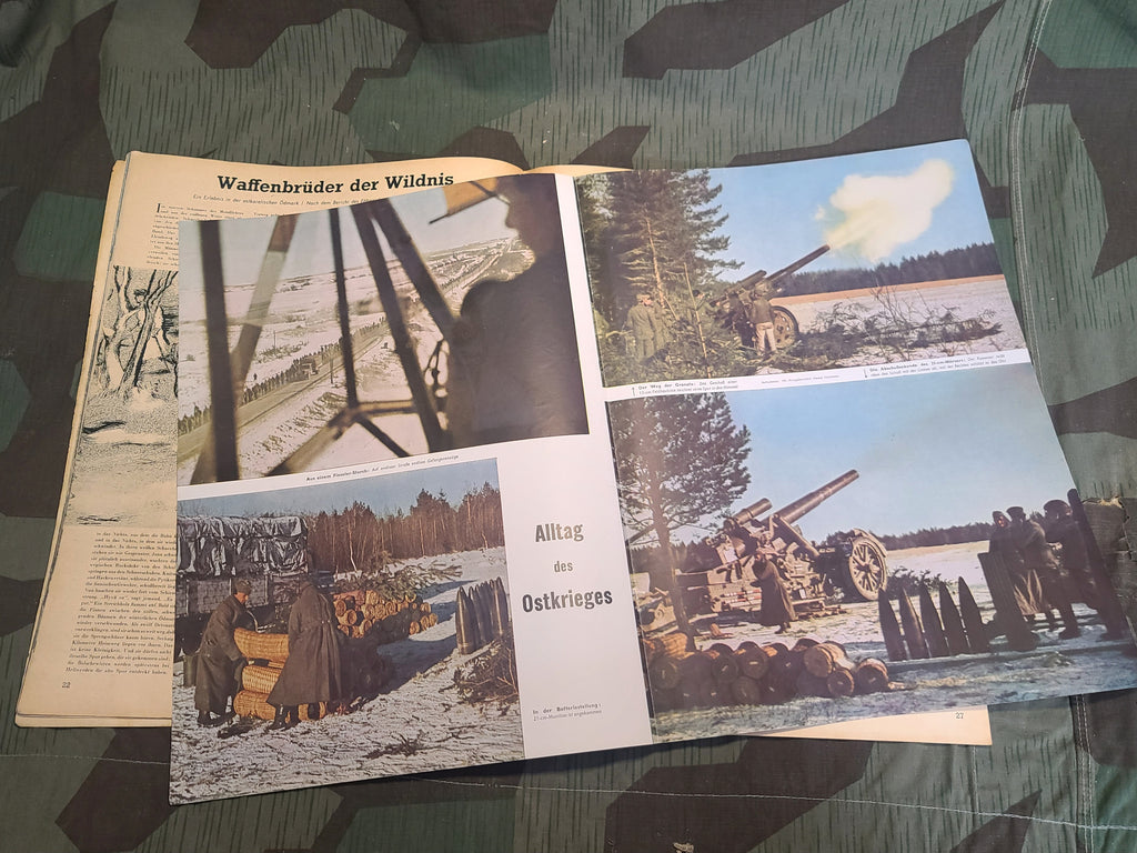Original February 2 1942 Signal magazine in German. Another nice issue of Signal with a number of good color pictures and lots of good ads. Lots of good Eastern Front photos. OK condition. Some tearing along the spine. The color centerfold has detached from the staples. May ship slightly rolled.
