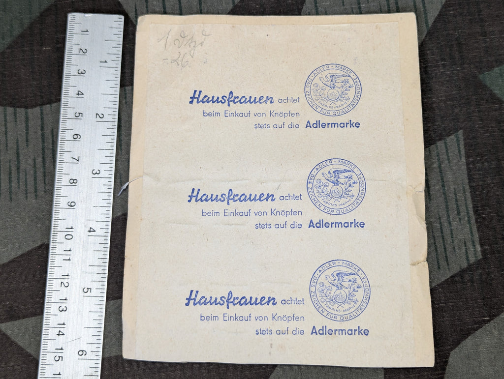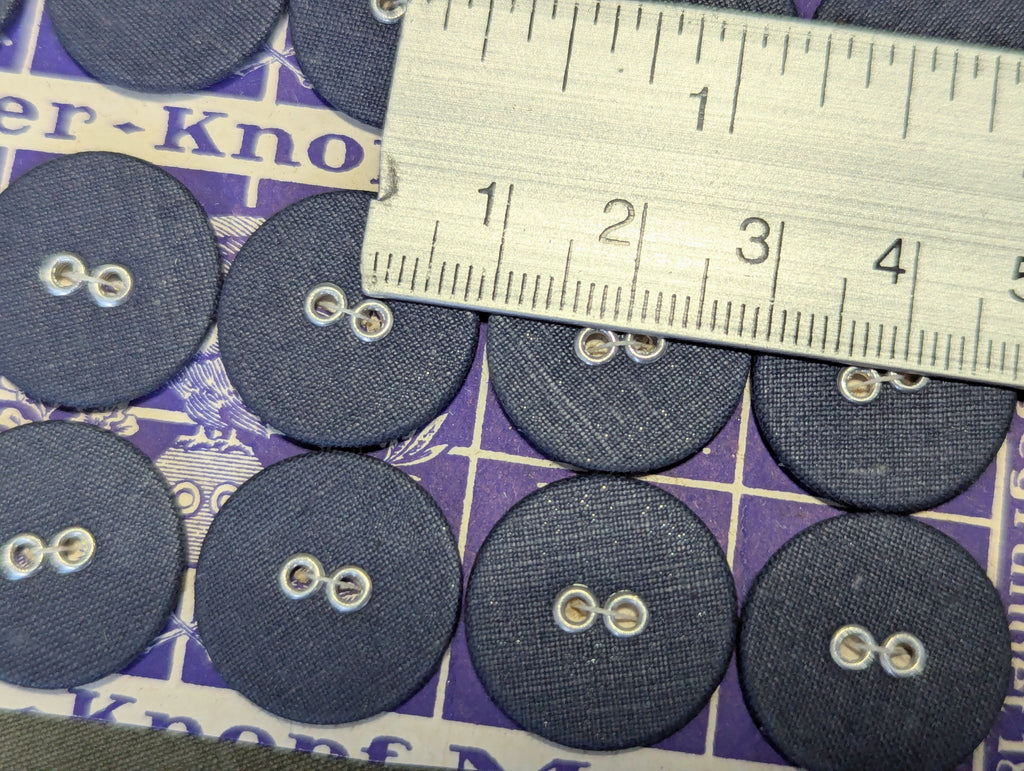Vintage prewar or wartime Frauenfreund blue cloth covered buttons on the original card. It looks like the bottom of the card has been cut off so it probably used to have a few more buttons on it. Buttons of this type are usually used on undergarments and bedding. Deustches Reichspatent. These are either wartime or prewar, as this company's items had obvious East German markings postwar. There are 24 total buttons and the measure 19mm in diameter.