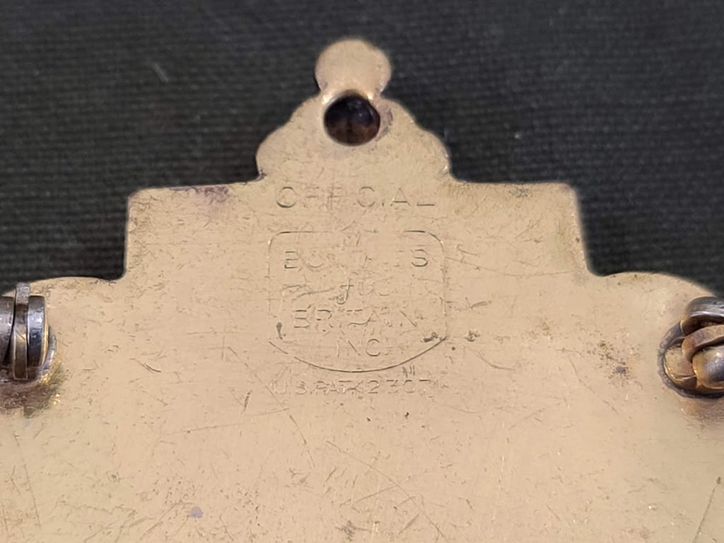 Vintage WWII British War Relief Society (BWRS) brooch with the emblem of a lion and shield and the motto "Dieu et mon Droit" ("God and my right").