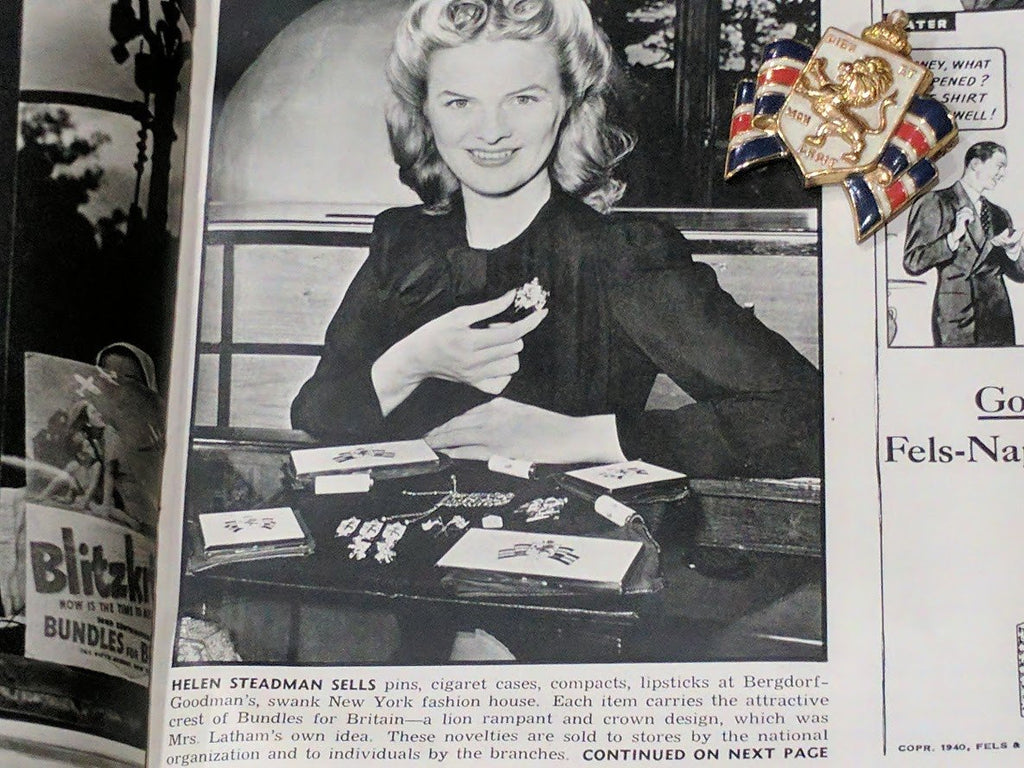 The back of the pin is marked "Official Bundles for Britain Inc U.S. Patent No. 123071". The patent is from 1940. This same pin appears on the cover of the Dec. 17 1940 edition of Look magazine. (Magazine NOT included, shown for reference only.)
