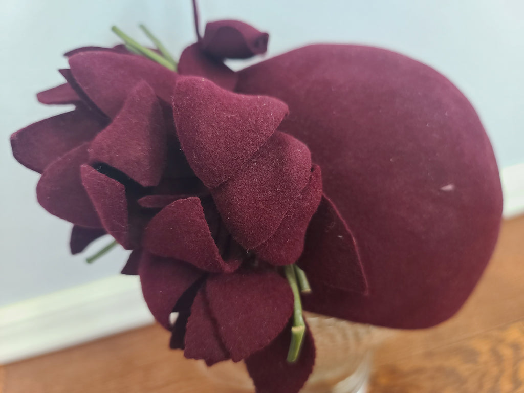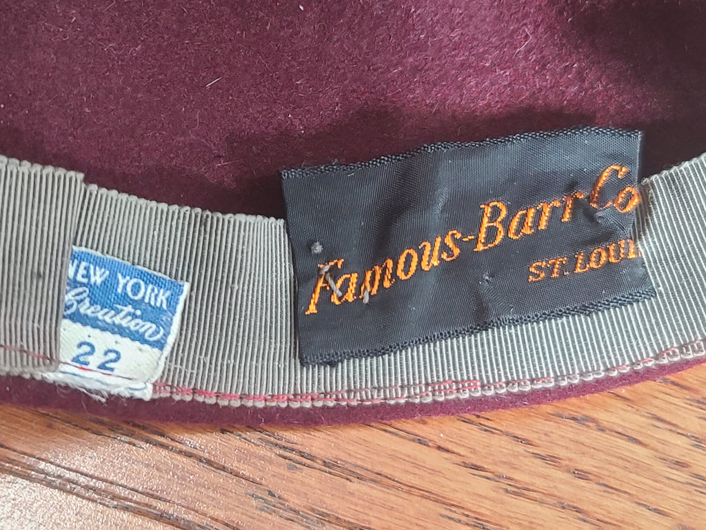 Vintage 1940s burgundy wine red felt hat. A bit of a tilt hat style. Flowers in the front. Nice labels inside: Famous-Barr Co St. Louis and Size 22 New York Creation tag. Fairly good, wearable condition but it does have a few flaws. The stems on some of the flowers are bent. Slight discoloration on the inside. Pulls in the material and very light moth tracking (no holes). See photos. - ← Previous Product Next Product →
