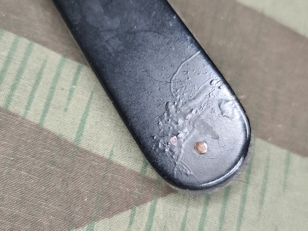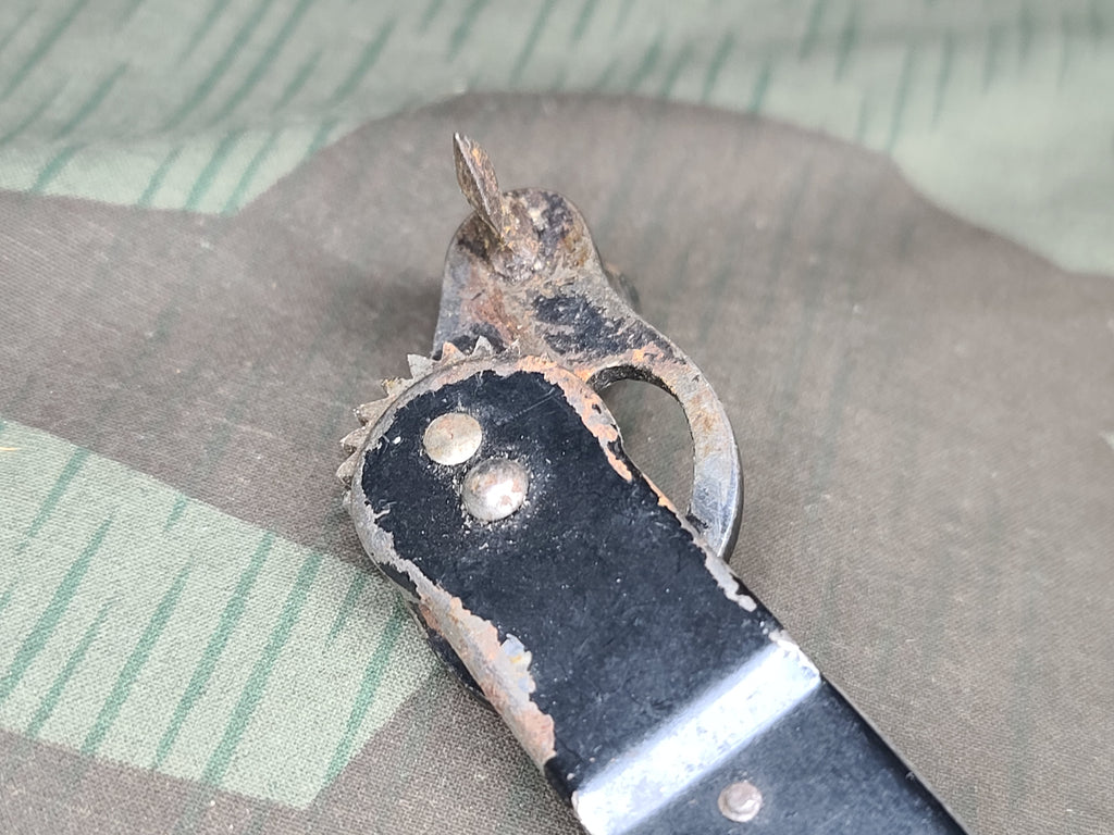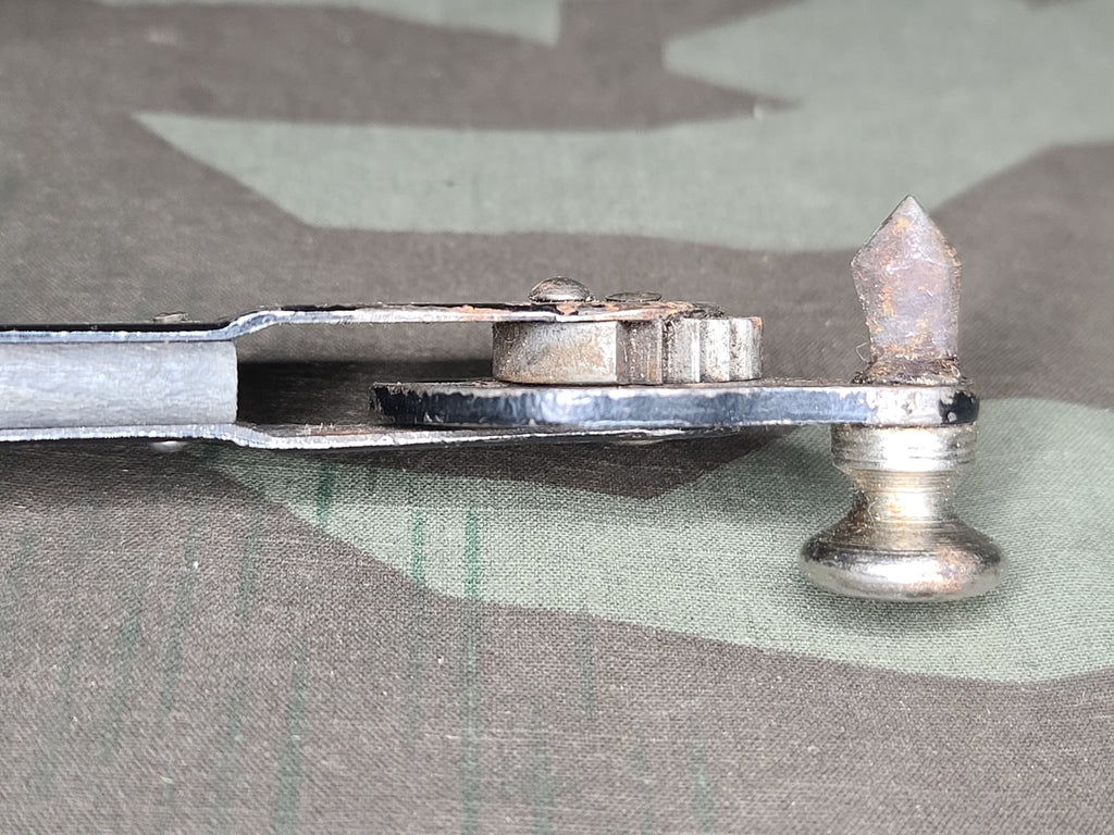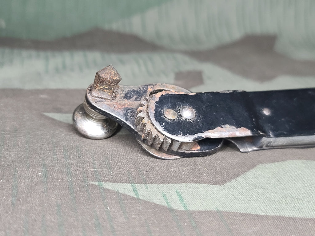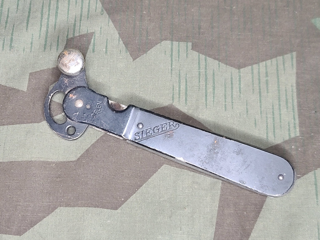 Sieger German can opener that works completely different than American types. You force the cutter through the can, then drag it around the edge. This design was popular in Germany for a long time and cheap crappy versions are still available in stores. This is an earlier style, made from steel and wood. It is in decent condition with some wear and rust. It is usable, but it needs a good cleaning. The cutter and teeth are still decently sharp.
