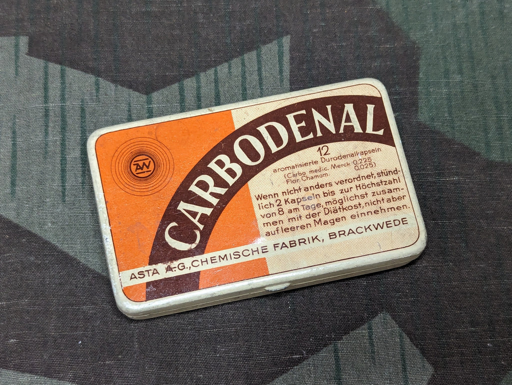 Period German Carbodenal pill tin. Good condition. Looks to be for iron deficiency. This doesn't have anything to date it, so it could be postwar. - ← Previous Product Next Product →