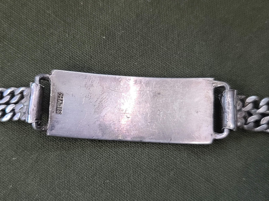 Vintage CBI China, Burma, India 1944 sweetheart bracelet with pilot wings. The bracelet is marked silver. It is well worn. Most of the detail is missing on the pilot wings and there is some wear and discoloration around them. There is also some missing enamel in the CBI insignia and in the text. Whoever originally owned this must treasured this and wore it a lot. - ← Previous Product Next Product →