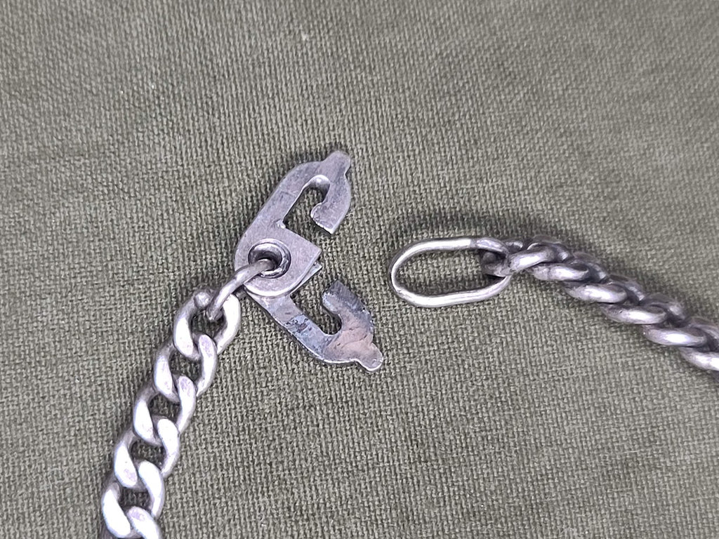Original WWII China Burma India (CBI) bracelet. Marked Silver on the back. Decent condition with some issues. A lot of the enamel has chipped off. There are scratches to the bracelet. The links connecting the main piece have some wear. - ← Previous Product Next Product →