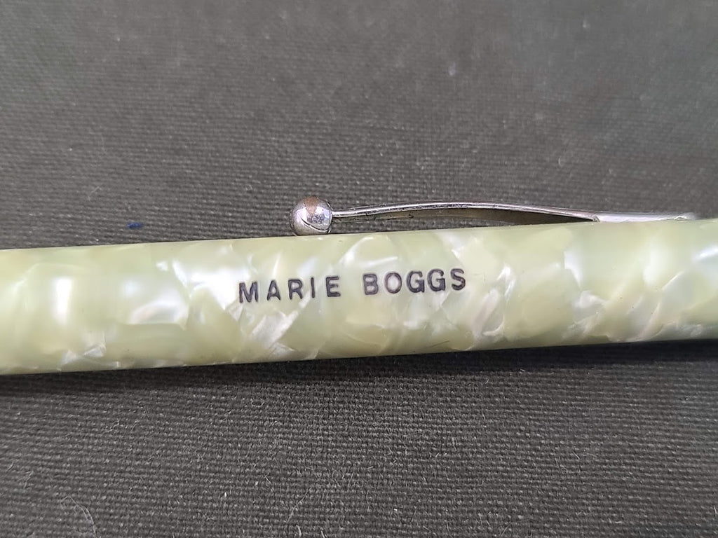 Vintage 1940s celluloid mechanical pencil named to Marie Boggs. It still works. Overall good condition with light wear. - ← Previous Product Next Product →