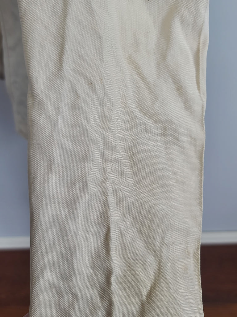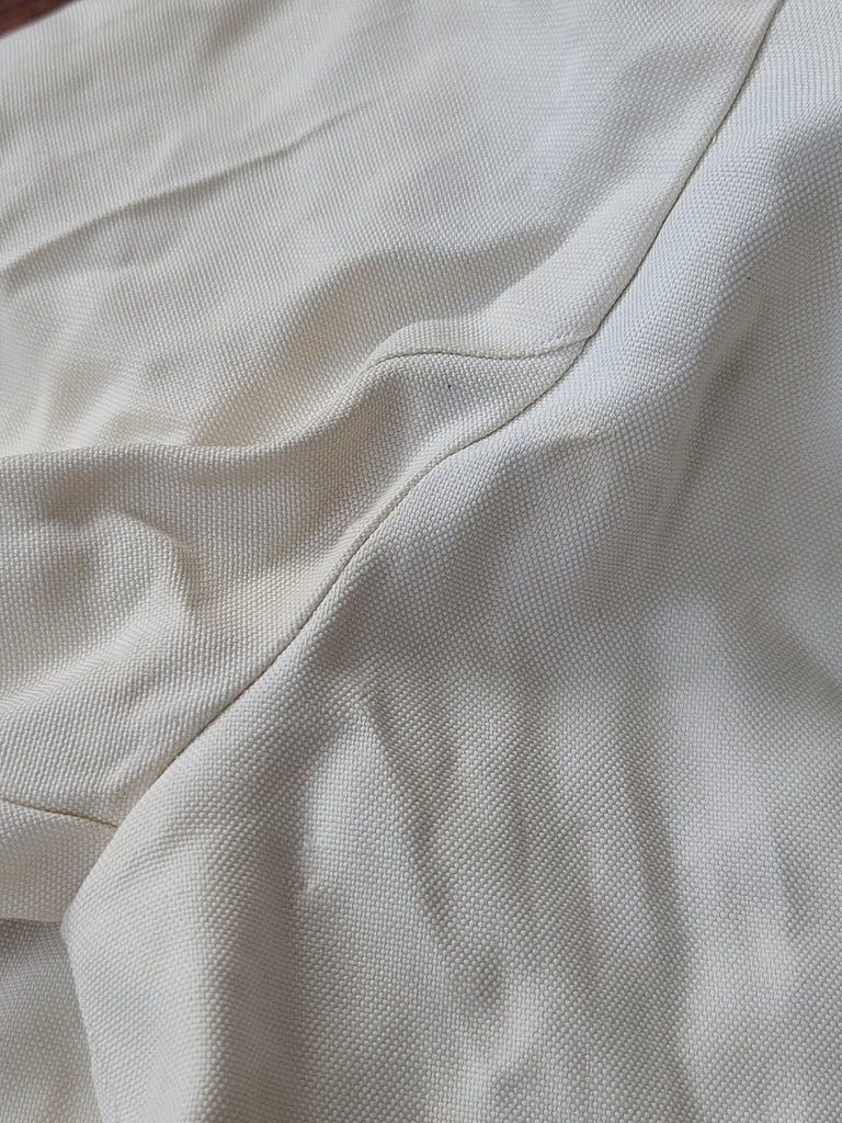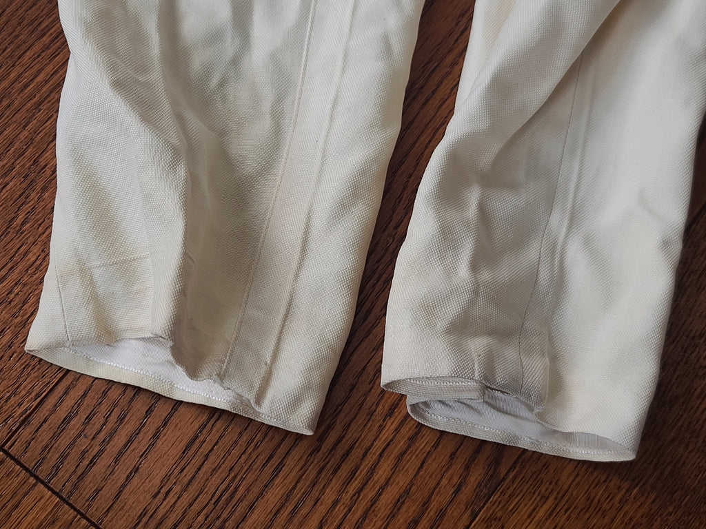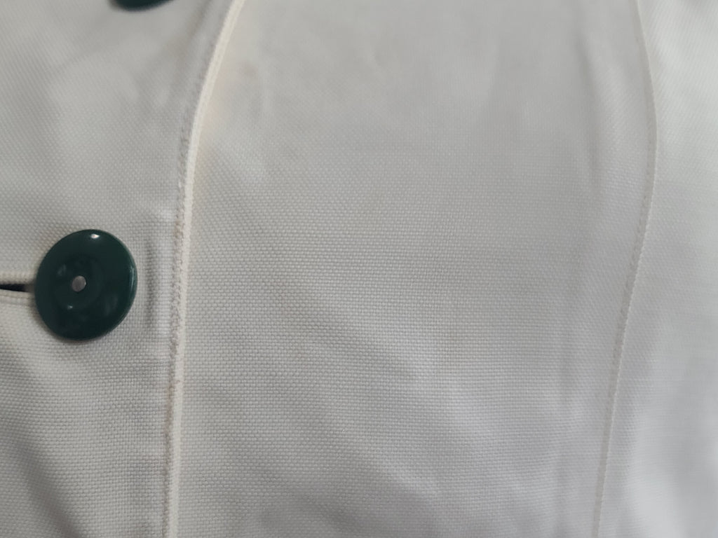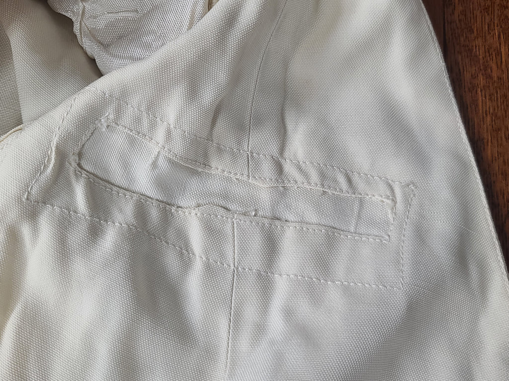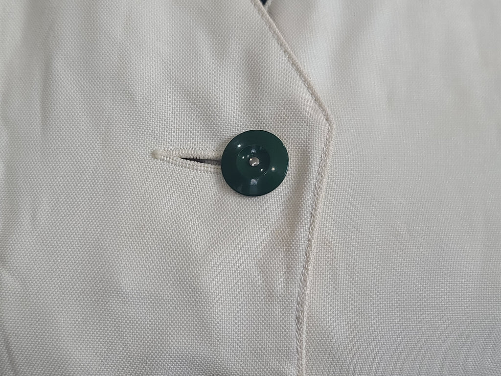 Sleeve - 22 1/2"White Navy WAVES summer uniform jacket that has been modified after the war (probably by the WAVE herself). The collar has been redone and the chest pocket flaps removed. The inner pockets are sewn shut. The cuffs look like they have been taken out a bit. The buttons were replaced with green buttons (held in place by cotter pins).