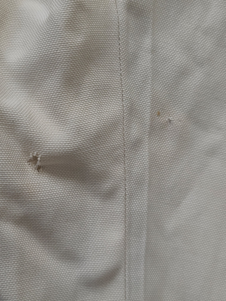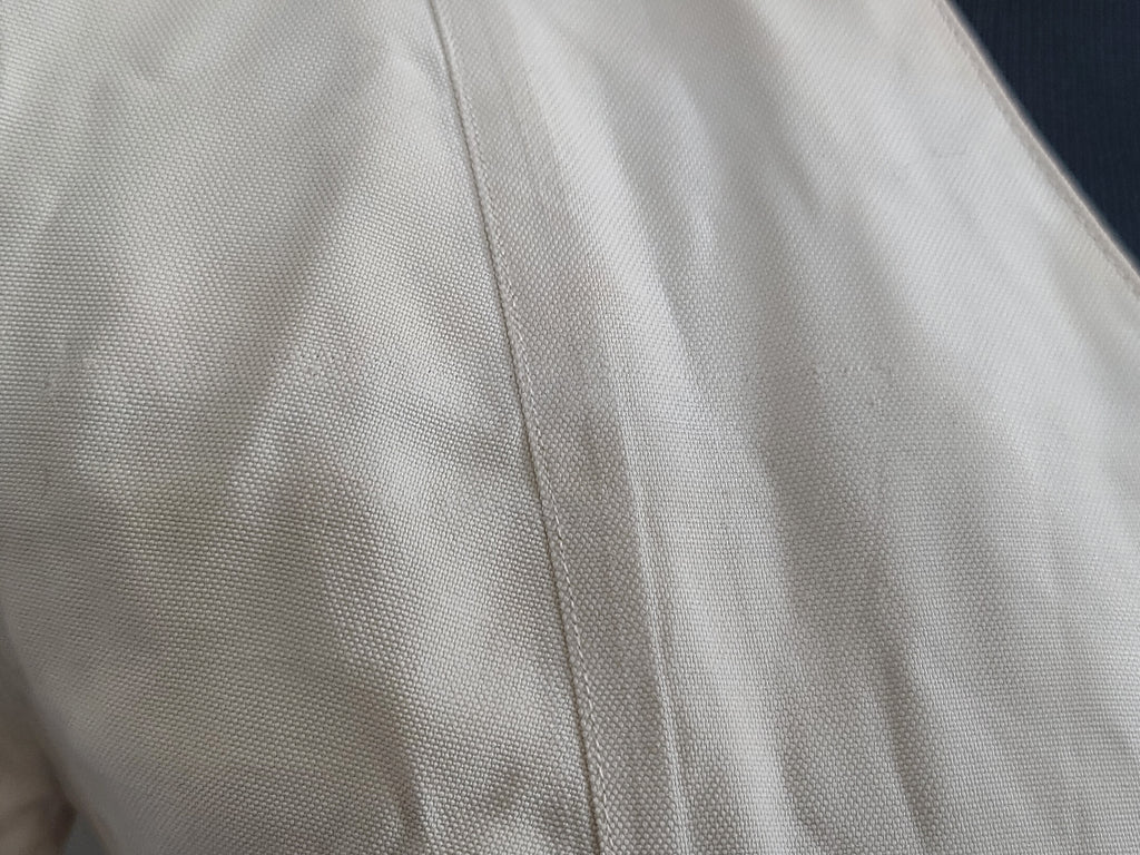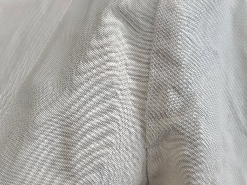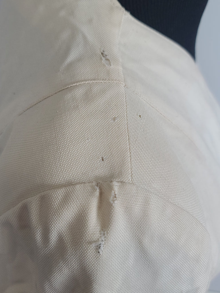 AS-IS condition with a lot of wear. There are a lot of light stains throughout (they are almost too light to show up in the photos). You can see residue from where the rank patch was sewn onto the sleeve. Some small holes on the sleeves and on the shoulders. Discoloration on the shoulders and down the sleeves. Some pulls in the material.