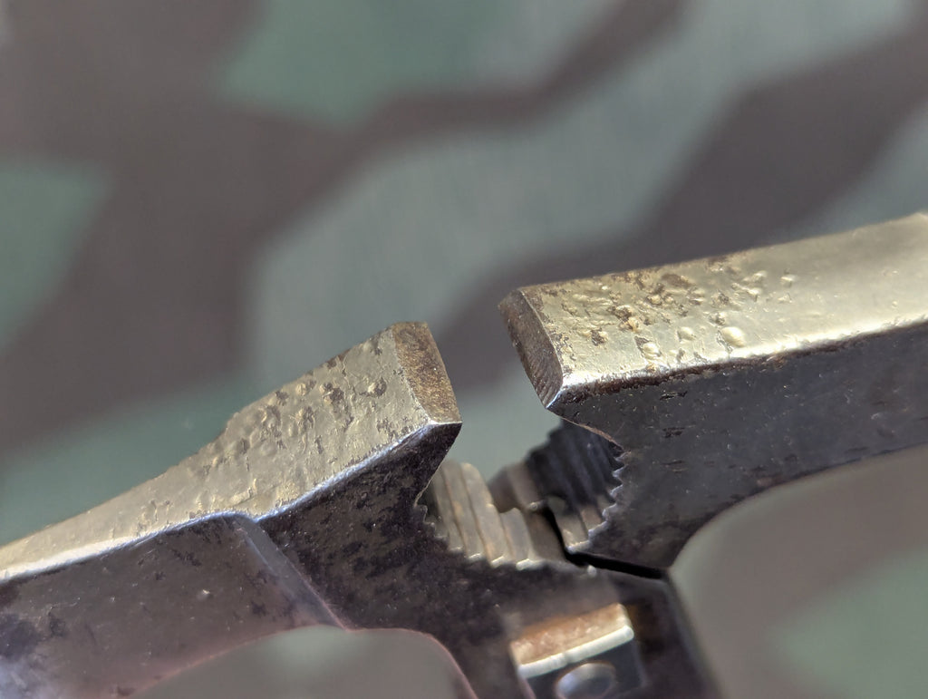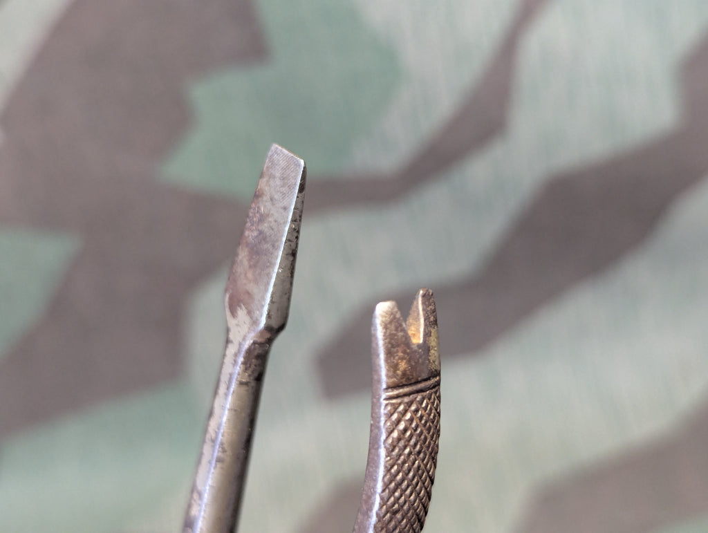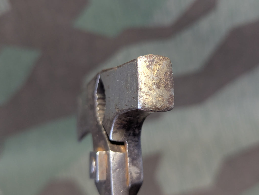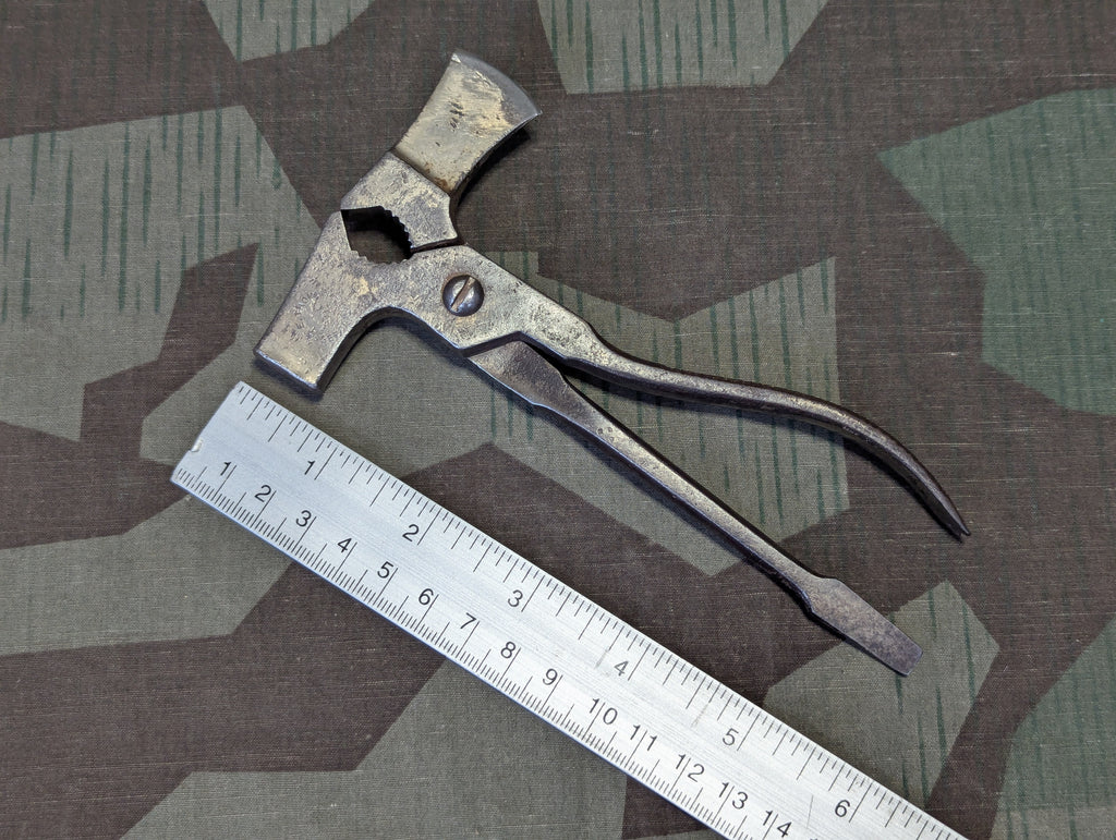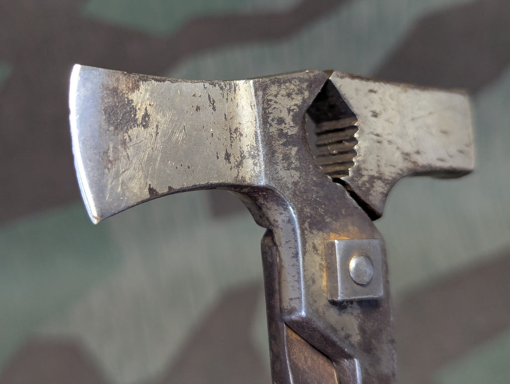 Original German multi tool commonly used for communications and pioneer work. It has some light wear from use and age. The hammer head looks to be the most used part and it's still pretty nice. The axe part seems to have been sharpened a bit. Marked E. Thomas Germany. This is on the small/medium side for this tool. I know of probably about 3 or 4 different sizes.