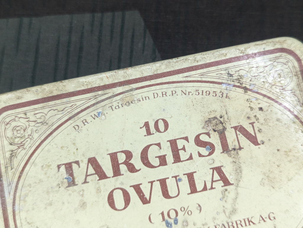Interesting Targesin Ovula tin for contraceptive suppositories. D.R.W.Z. and D.R.P. marked. Fair condition with some wear. - ← Previous Product Next Product →