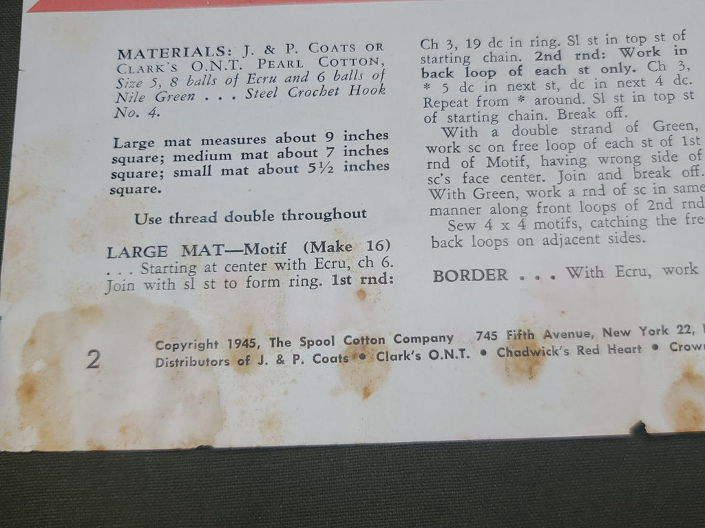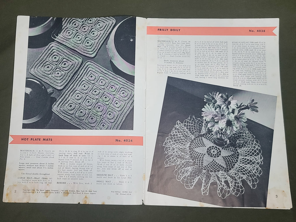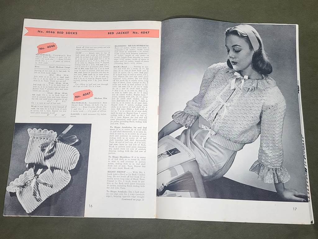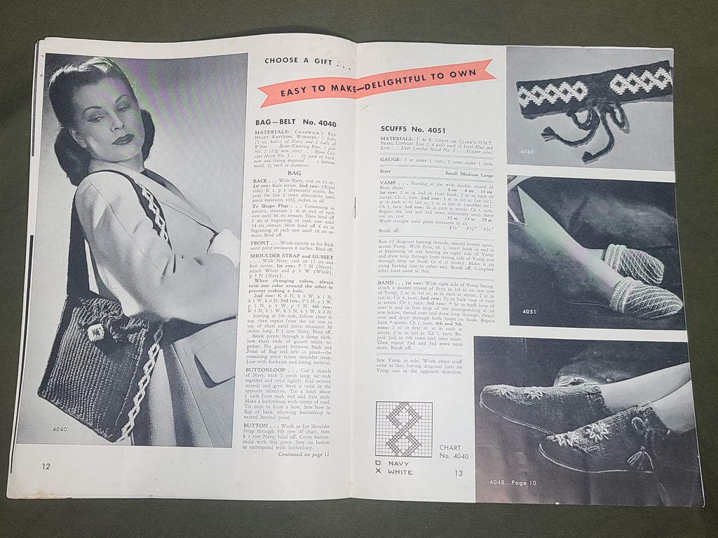 Vintage Crochet and Knit Gifts pattern booklet. Dated 1945, The Spool Cotton Company. Kitchen and home decor pieces, slippers, purses, clothing, etc. There is some staining and water damage along the bottom. Small tear on the back cover corner. - ← Previous Product Next Product →