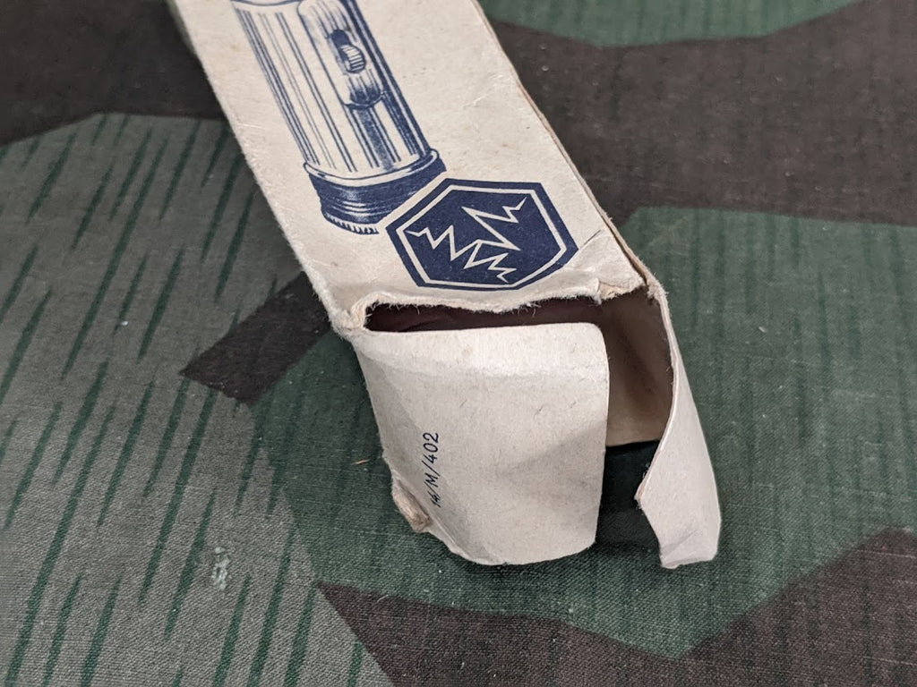 German Daimon flashlight with a little slip of red paper inside with Bulgarian instructions on it. Possibly a wartime export? The instructions were clearly an afterthought to the production of the packaging so possibly a rushed job. The box is fairly clean but a bit crushed and missing a closure flap on one end. The flashlight is in good condition. - ← Previous Product Next Product →