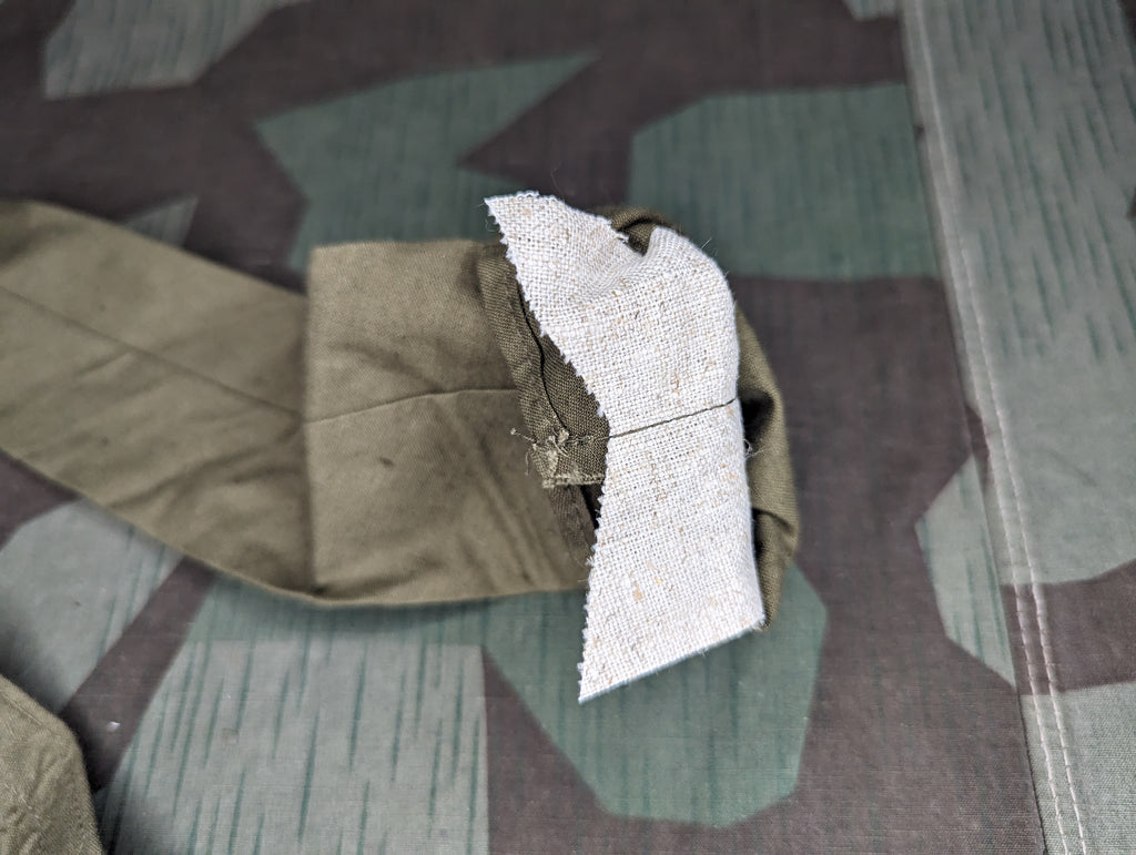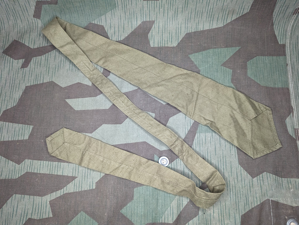 Original Afrika Korps neck tie. It is unissued but has some light storage wear or a little dirt; still in overall nice, presentable condition. It is a size 1 with nice markings. It measures about 48" long. There are several variations in material for these types of ties; this one is a plain weave cotton. - ← Previous Product Next Product →