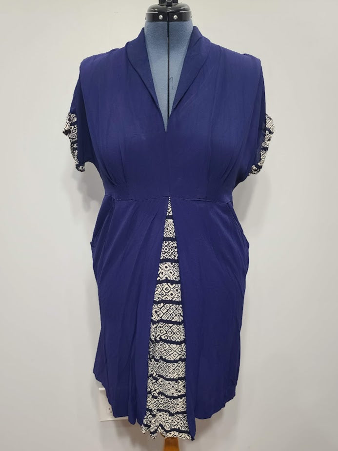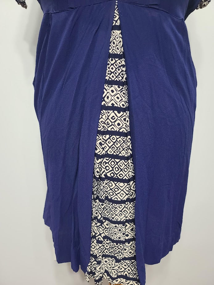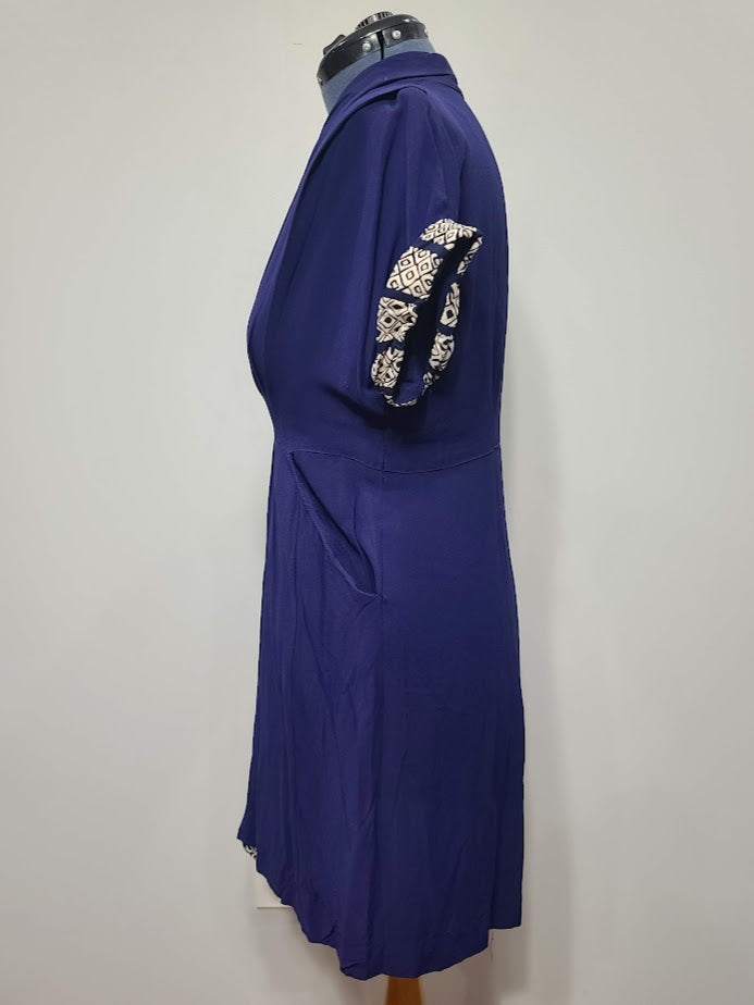 Vintage 1940s dark blue rayon dress with abstract print trim.