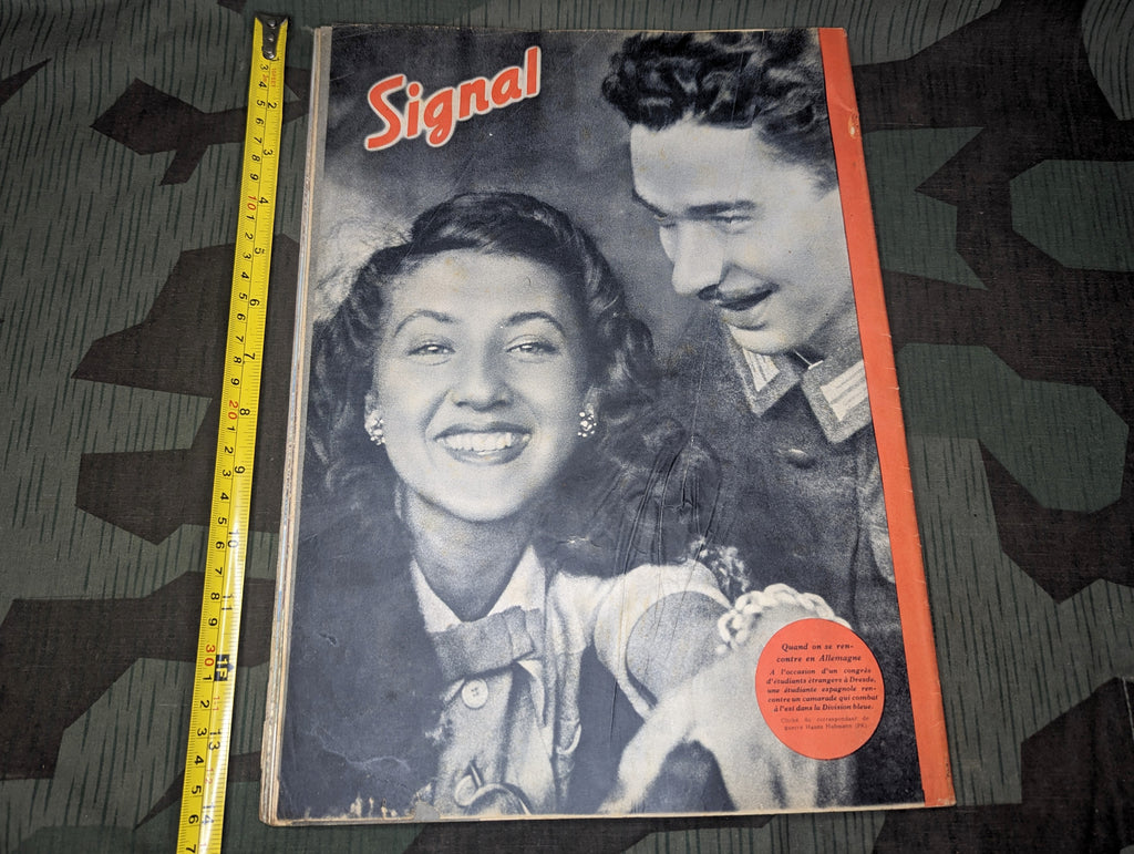 Original December 1942 Signal magazine in French. This one has some decent color pictures inside and some good ads. It seems at least a bit larger than a normal Signal. Perhaps because it is December and seems to be 2 issues in one. - ← Previous Product Next Product →