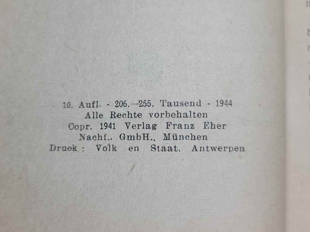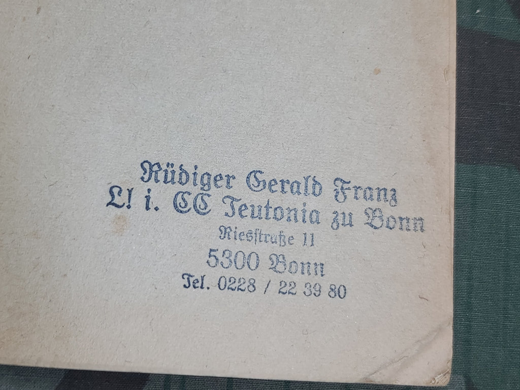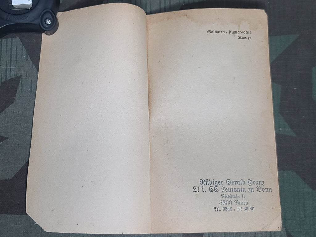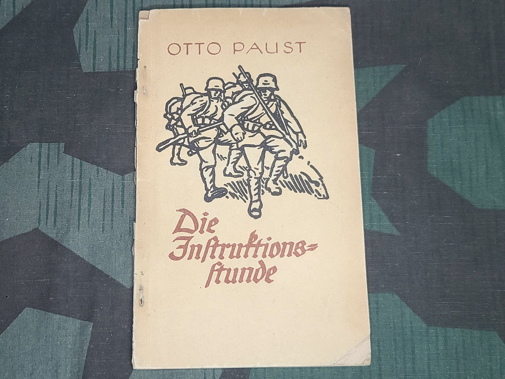 Die Instruktions Stunde book by Otto Paust. Part of the Soldaten - Kameraden! series printed by the Zentralverlag der NSDAP. Printed in 1944. AS-IS poor condition. The spine has lot of wear and the covers are loose (still attached, but barely). Some staining and some tears on the corners.