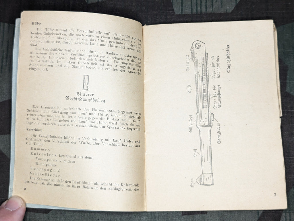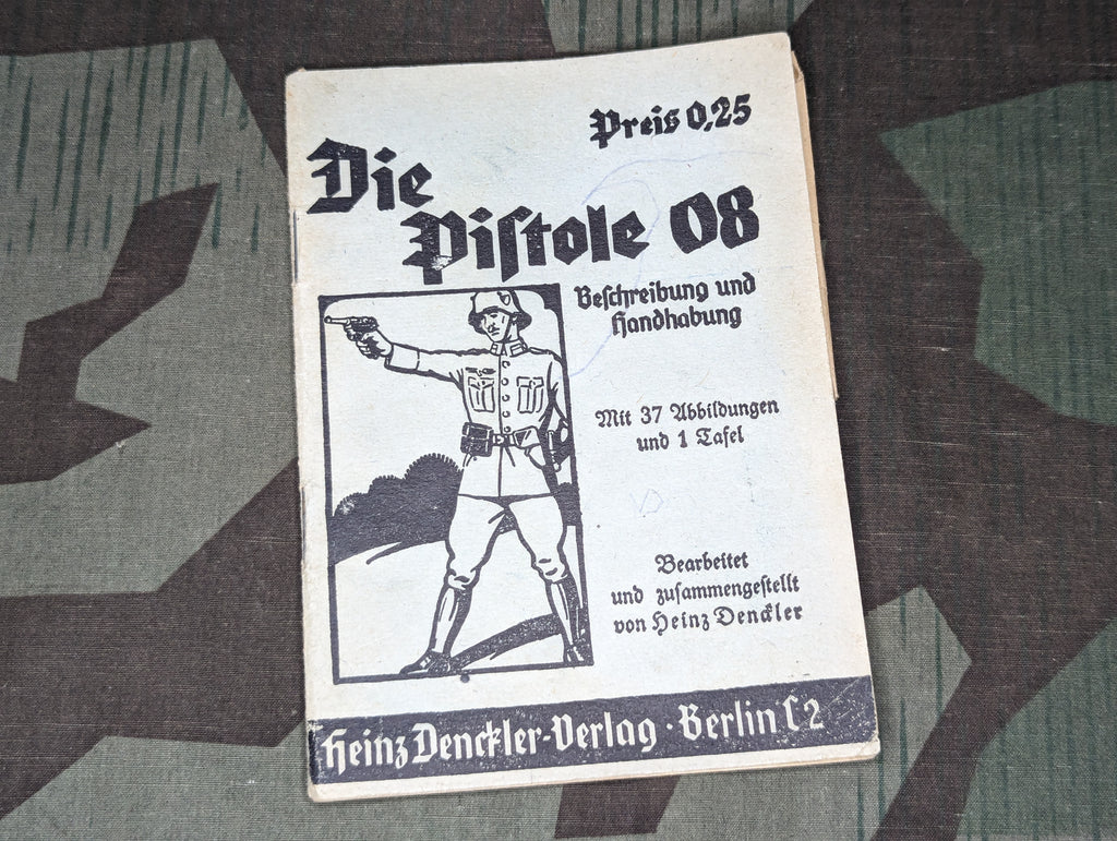 Original Luger Die Pistole 08 handbook. It covers the construction, care, maintenance, and firing. It is in decent, but not perfect condition. It has some general wear and there is some pencil scribble on the cover. - ← Previous Product Next Product →
