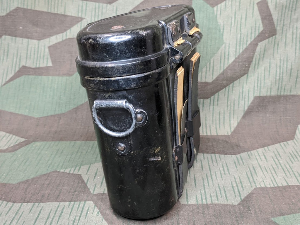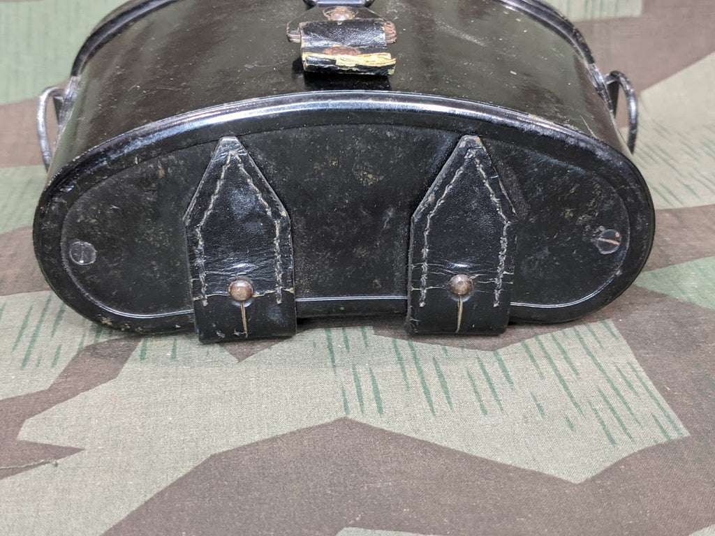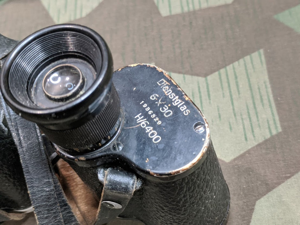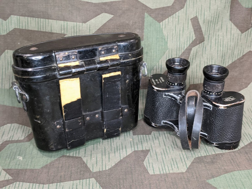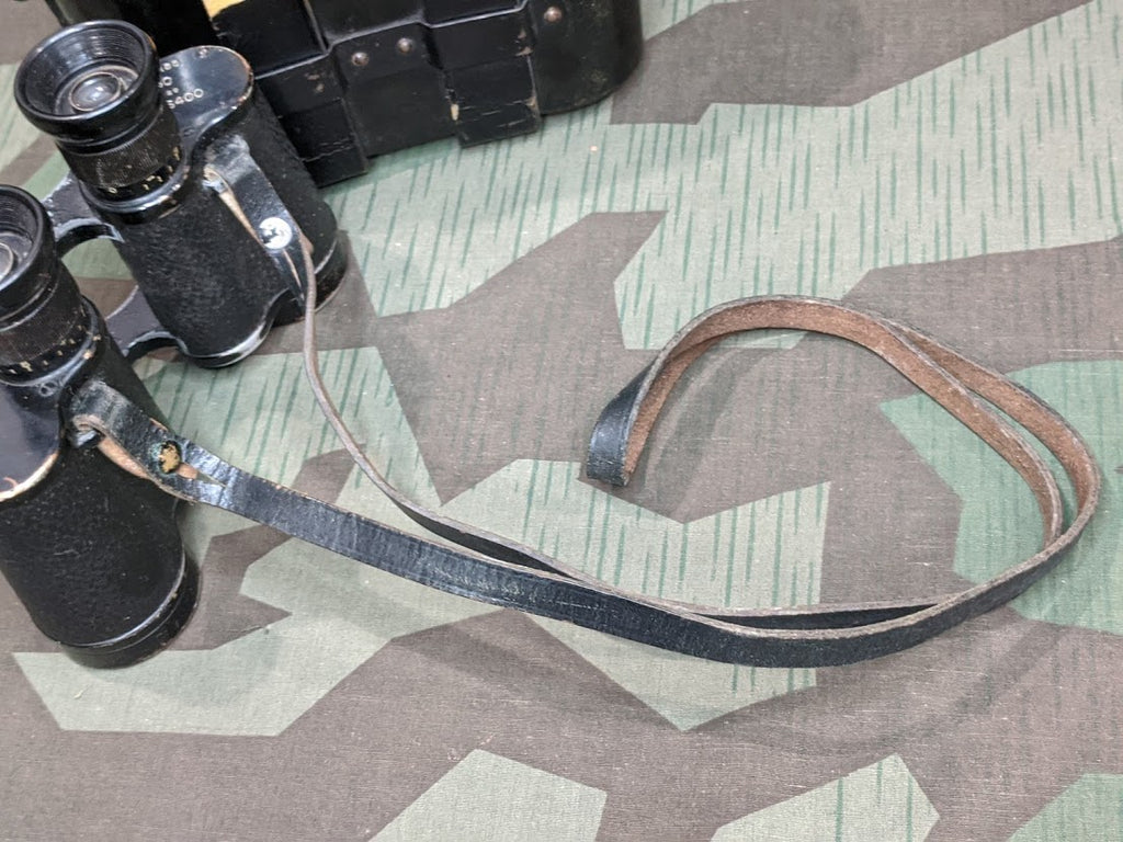 Original Wehrmacht army binoculars Dienstglass with strap and Bakelite case. The binoculars are in good condition with normal wear. The optics are not perfect, but are pretty good. The neck strap is original and in good condition, just a little stiff. The Bakelite case has bad belt loops which is typical since these are made from layered treated paper of the lowest quality. The belt loops are basically always destroyed. The Bakelite itself, including the hinge are in good condition. The hinges are typically rotten and broken but this hinge is very free moving. - ← Previous Product Next Product →