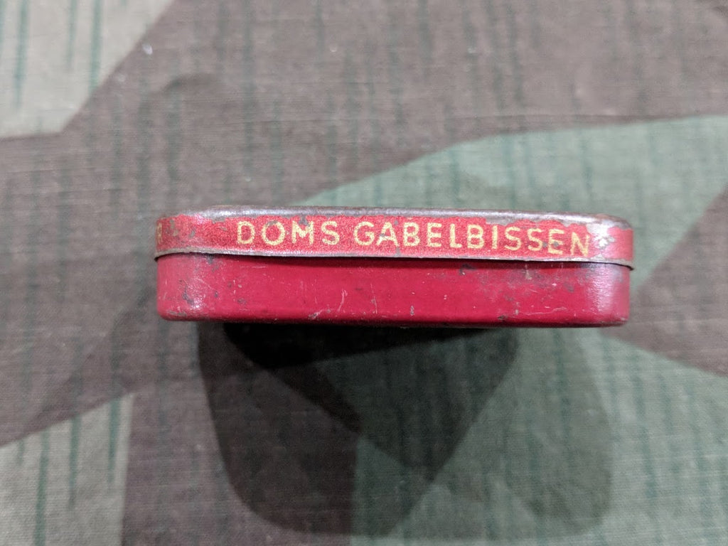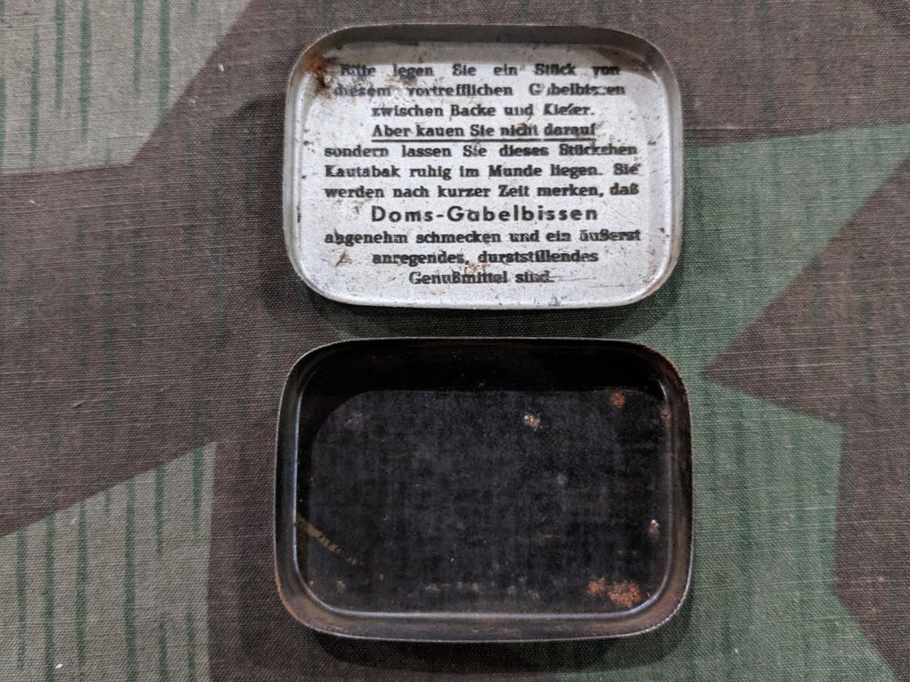 Period empty German chewing tobacco tin. Doms Gabelbissen: the tobacco treat for everyone that doesn't want to, or isn't allowed to, smoke. At least that's what the tin says. It does show wear. It is a small tin, measuring about 2 1/18" by 1 1/2" - ← Previous Product Next Product →