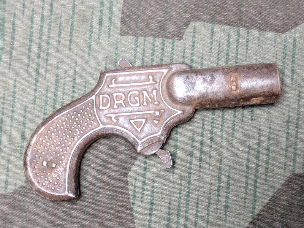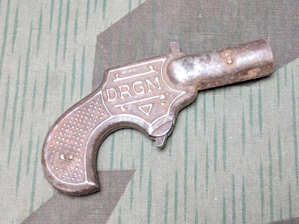 Early 1900's-1930's German DRGM marked toy gun, possibly a marble shooter in decent, worn condition. It is a simple mechanism, the trigger and cocking arm are basically just a lever that operate a rod that pops a projectile out. It measures about 4 1/4" long.