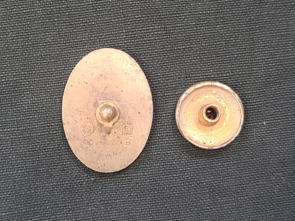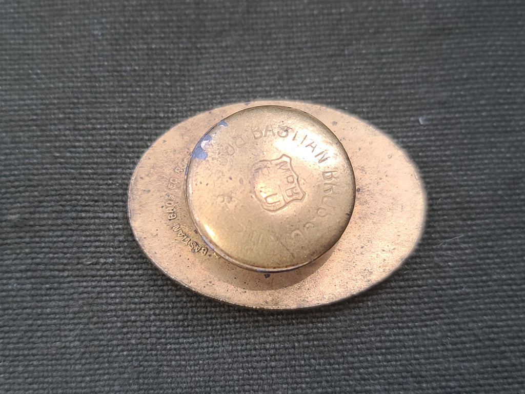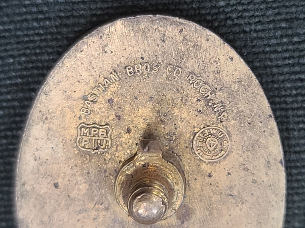 Original WWII E For Production United States Navy Bureau of Ordnance Naval Gun Factory screwback pin. The back is marked Bastian Bros Co Roch, NY. Both the screwback piece and the pin are marked, although the markings on the screwback piece are harder to read. Overall good condition. Most of the wear is on the back side.
