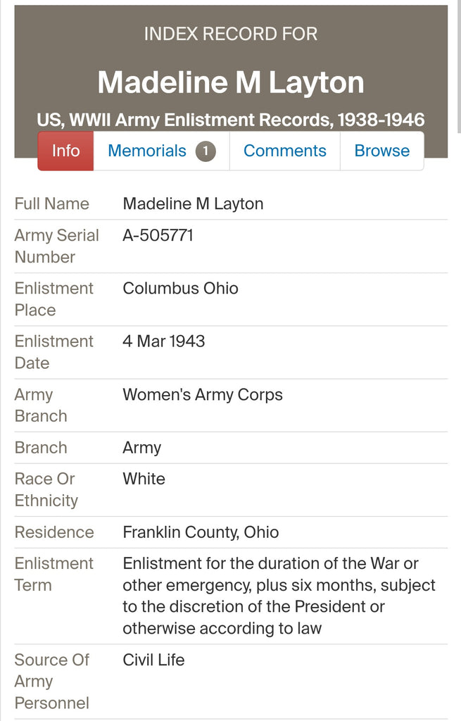 She was born December 31 1908 and enlisted on March 4, 1943 in Columbus, Ohio. Her occupation was listed as "semiskilled inspectors, n.e.c." Her martial status: divorced, without dependents. Level of education: 1 year of college. Source