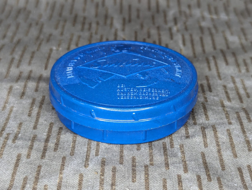 East German Blue plastic cough drop container. It needs a cleaning. There is a small chip around the edge of the bottom half but it doesn't effect its use.