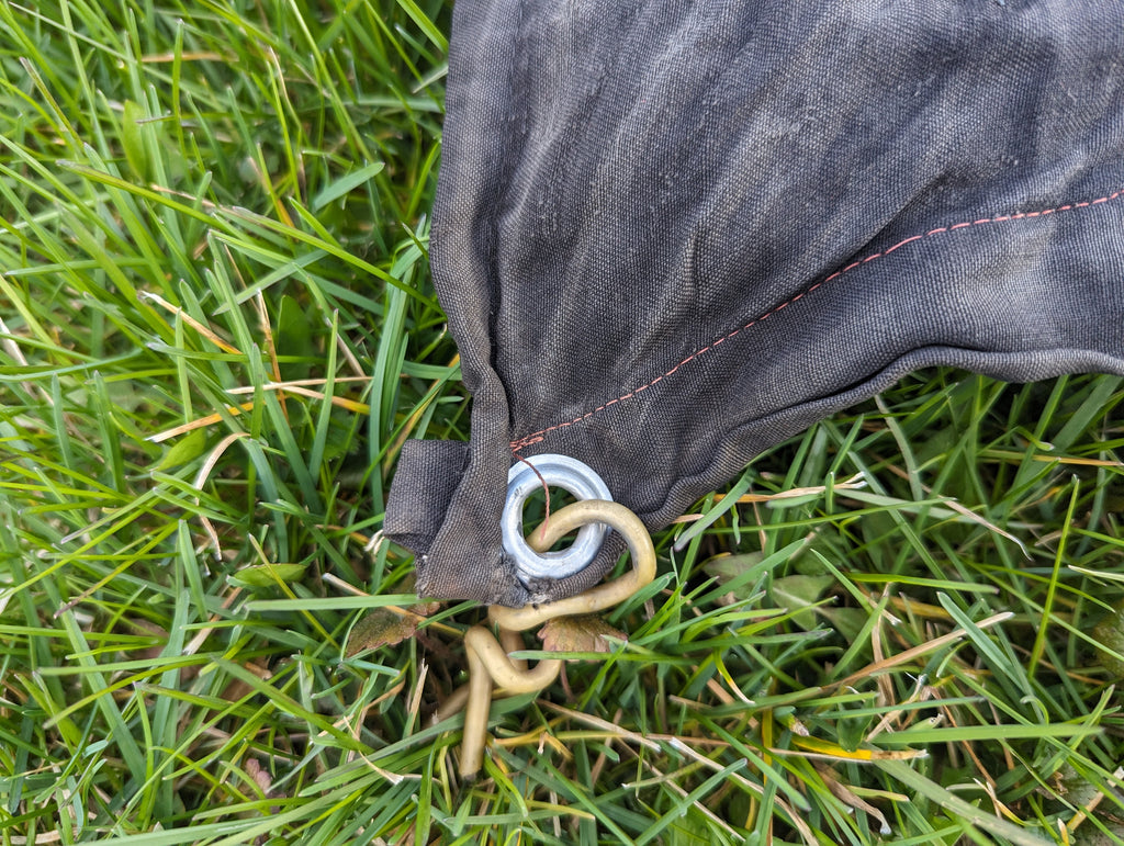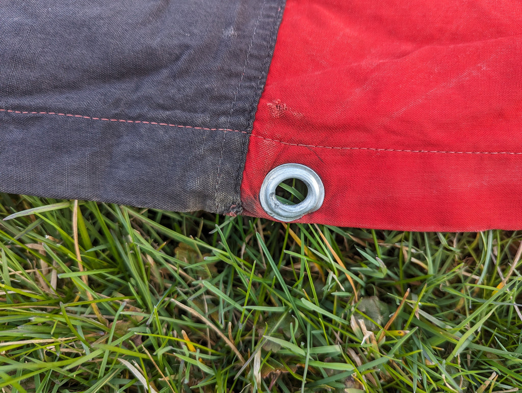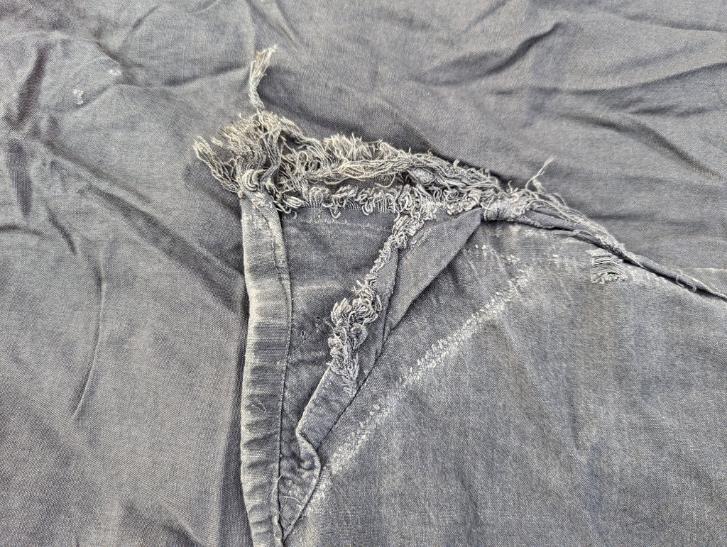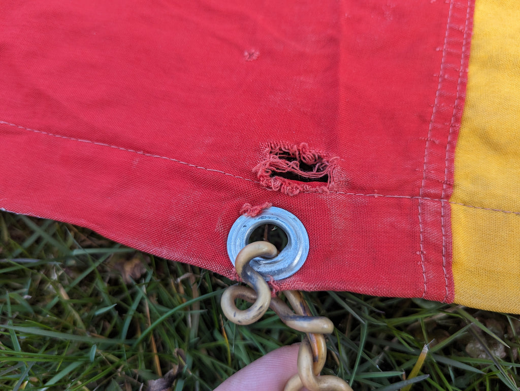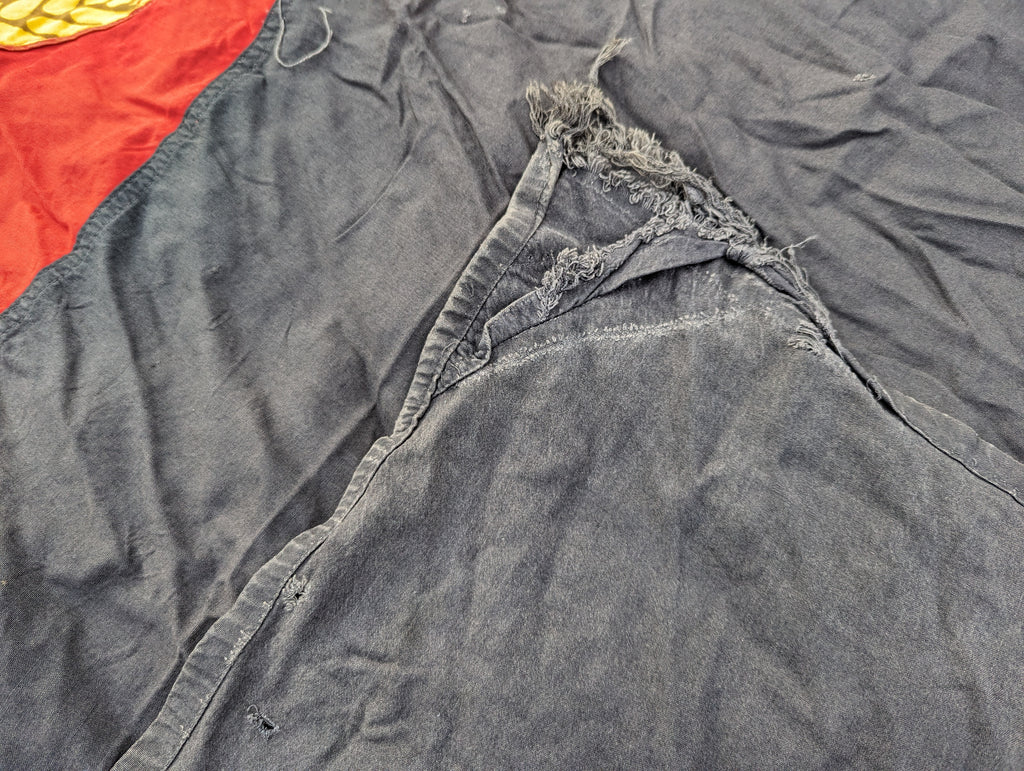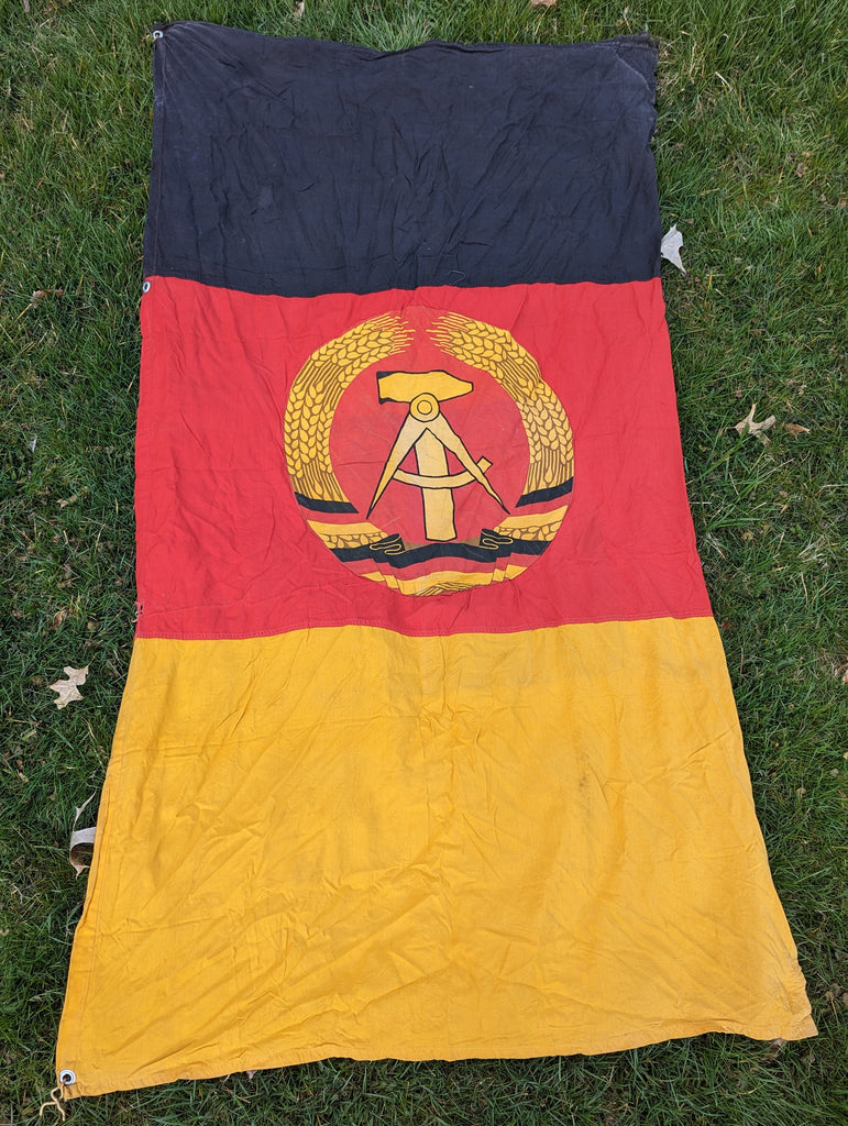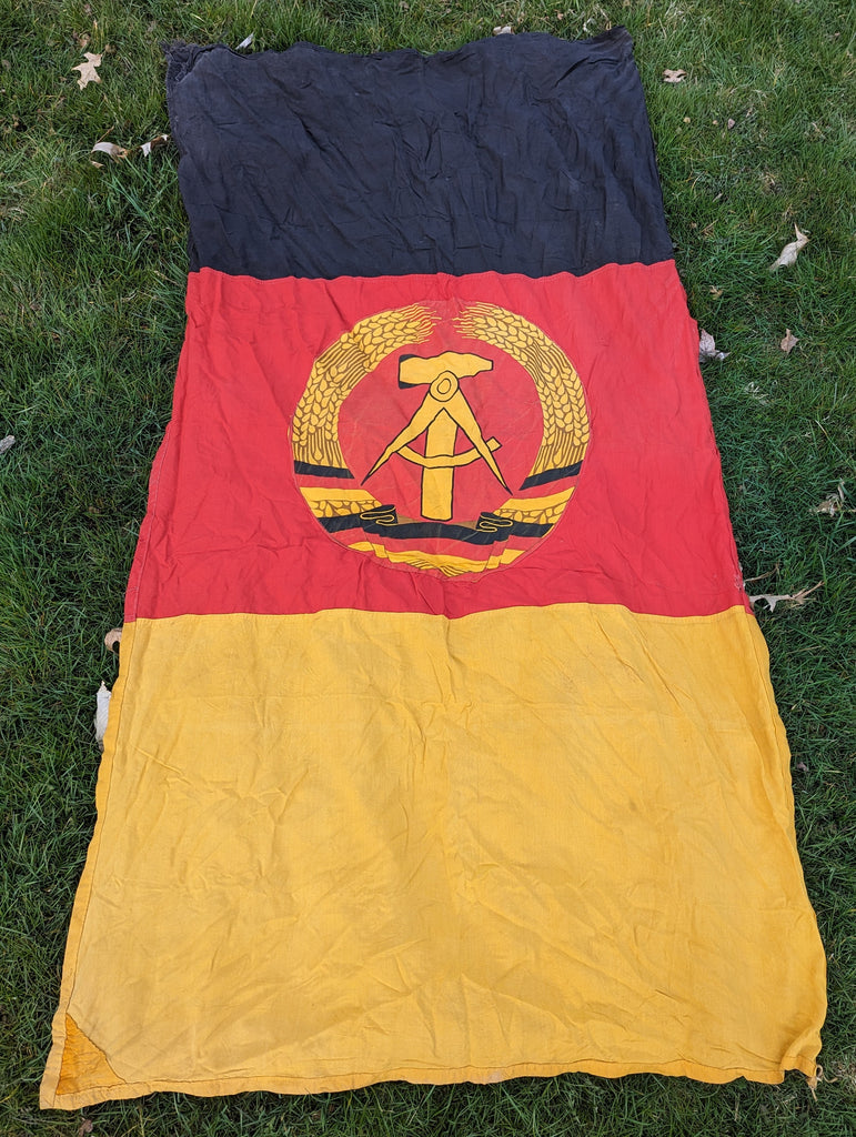 Early East German flag made from more natural materials and a mix of printing and sewn panels. This one is rather unusual, as it appears to be made to fly on an upright pole rather like the "open" flags you see outside of most US antique stores. It does show some wear and tear. It measures approximately 85" by 46" (7 foot 1 inch by 3 feet 10 inches)