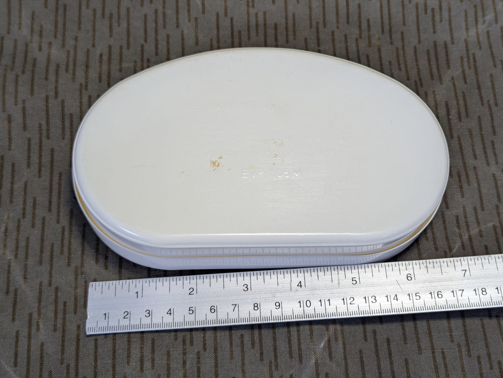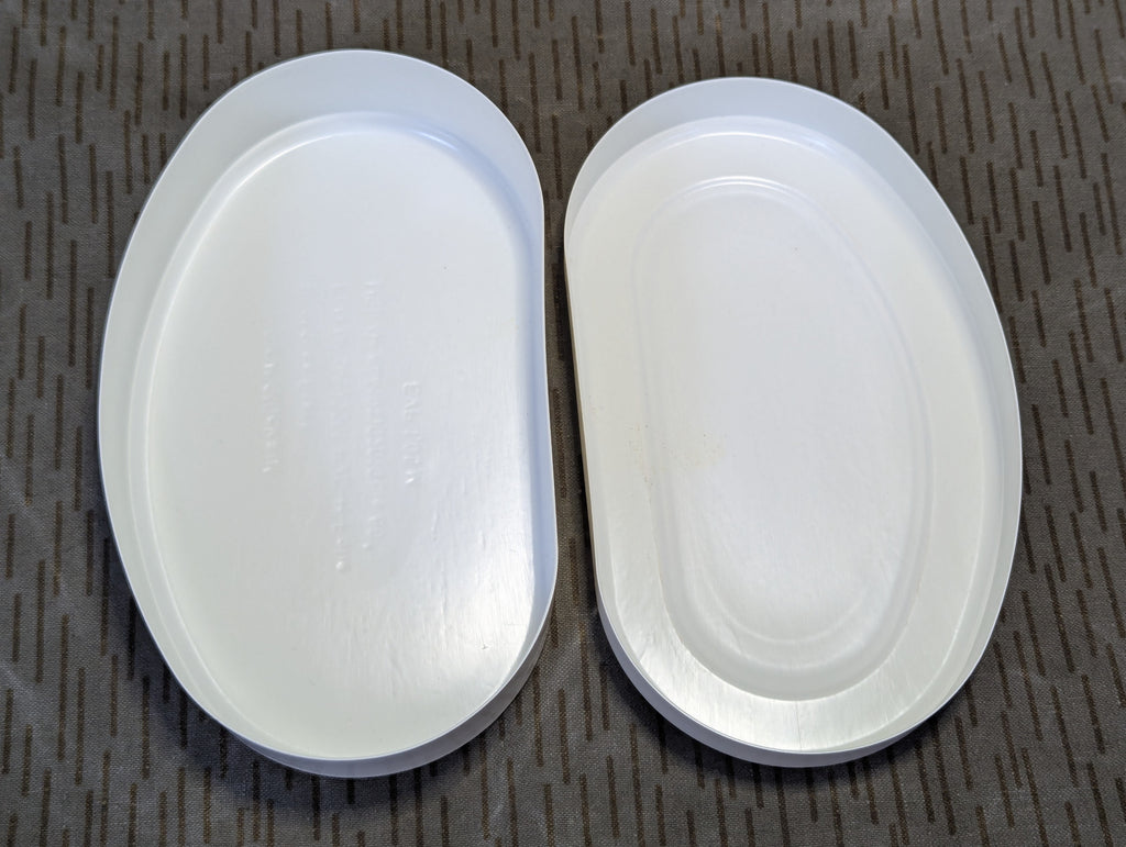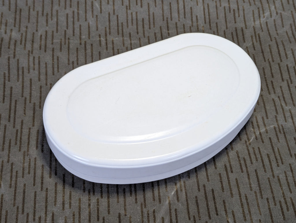 East German white plastic bread container. Much like the WWII era ones, but made from very thin, flexible plastic. The bottom has a brand name VEB Glück Auf on it along with some numbers the fixed price EVP. 1.05 M (I guess they never anticipated a collectors market). It has some light wear.