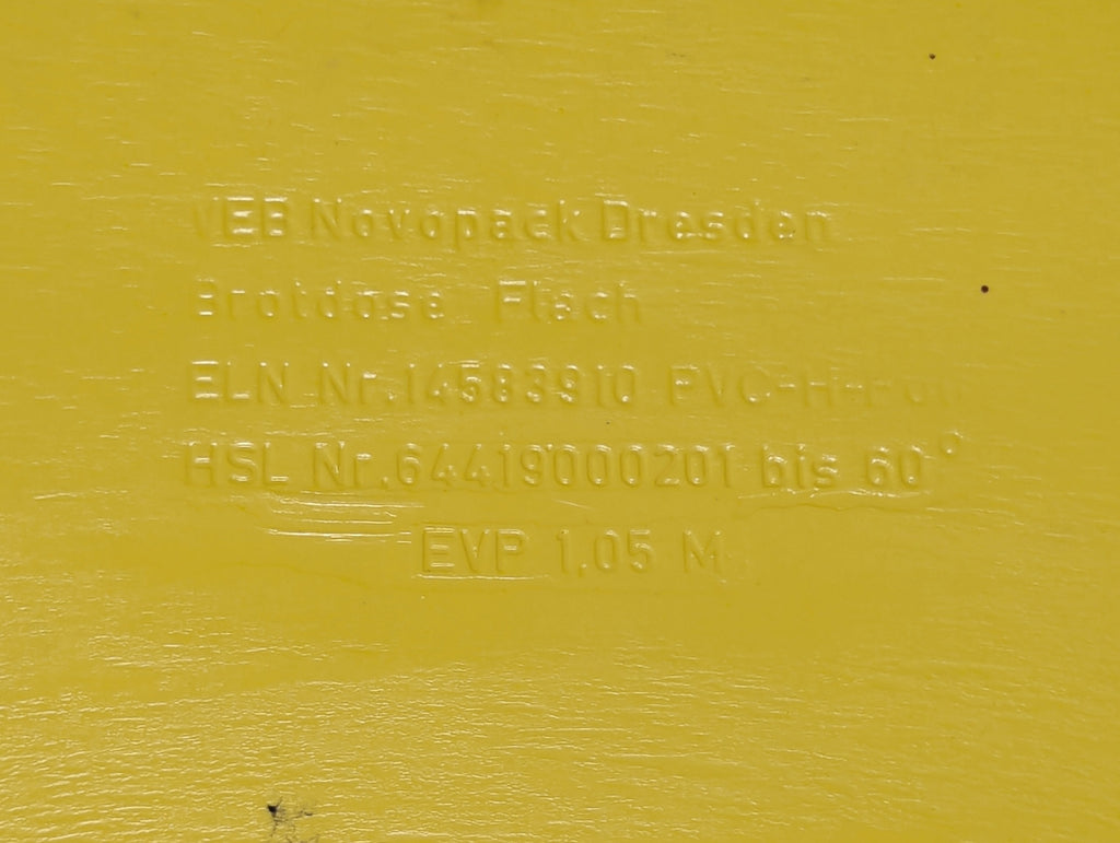 East German fun, happy yellow plastic bread container. Much like the WWII era ones, but made from very thin, flexible plastic. The bottom has a brand name VEB Novopack Dresden Brotdose "Flach" on it along with some numbers the fixed price EVP. 1.05 M (I guess they never anticipated a collectors market). Some brown specks in the plastic.
