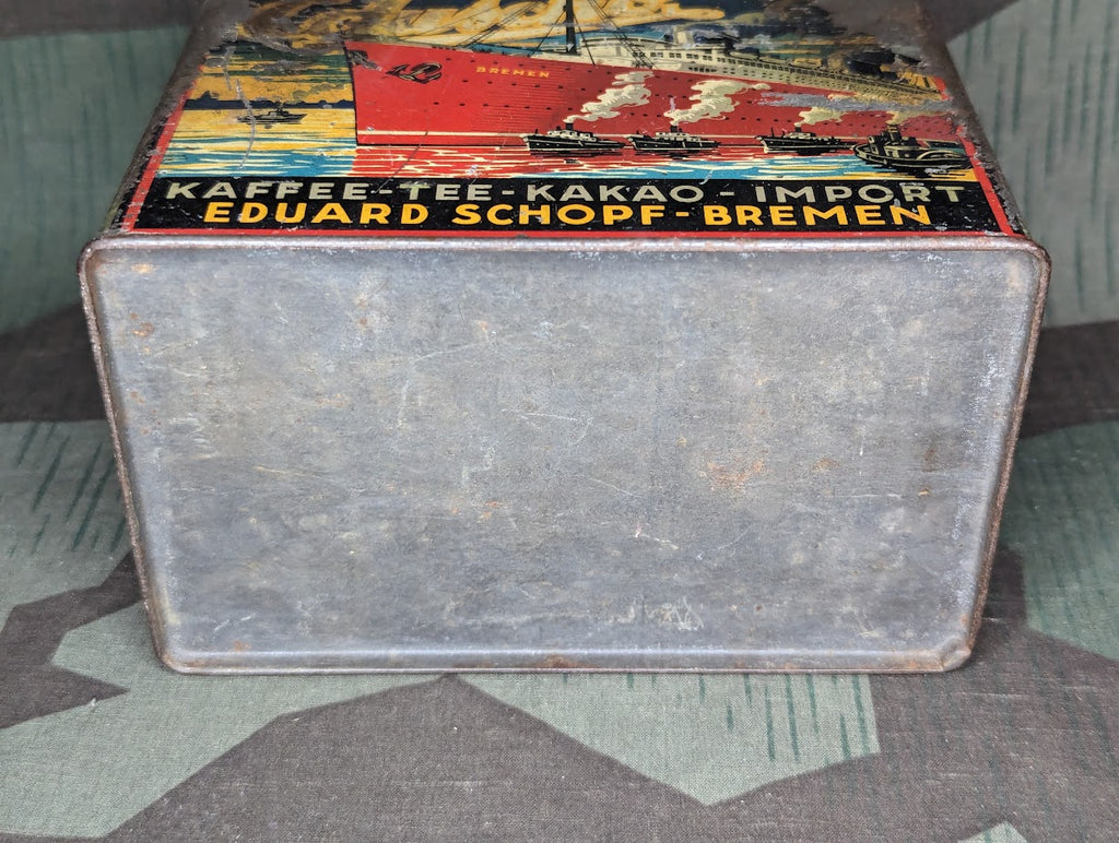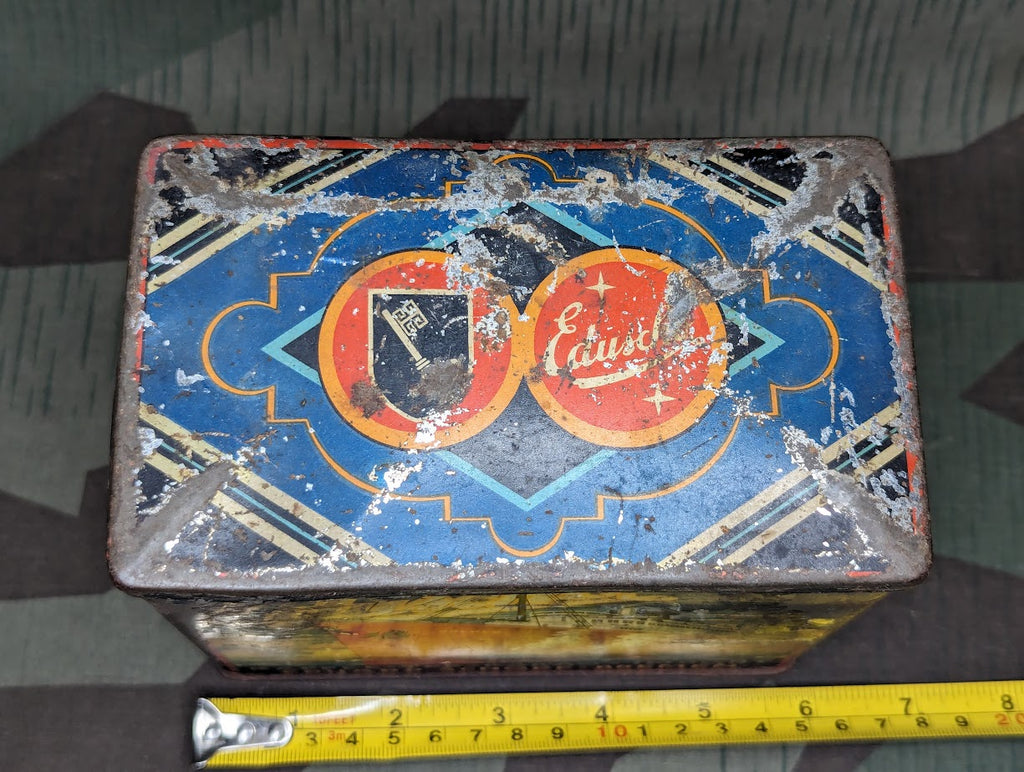 Here is a worn but rather cool Eduscho coffee tea cocoa sales tin. I have seen many Eduscho tins in my time but not one with these graphics. Nice ship on the front and a stack of animals staring longingly into a house on the sides. - ← Previous Product Next Product →