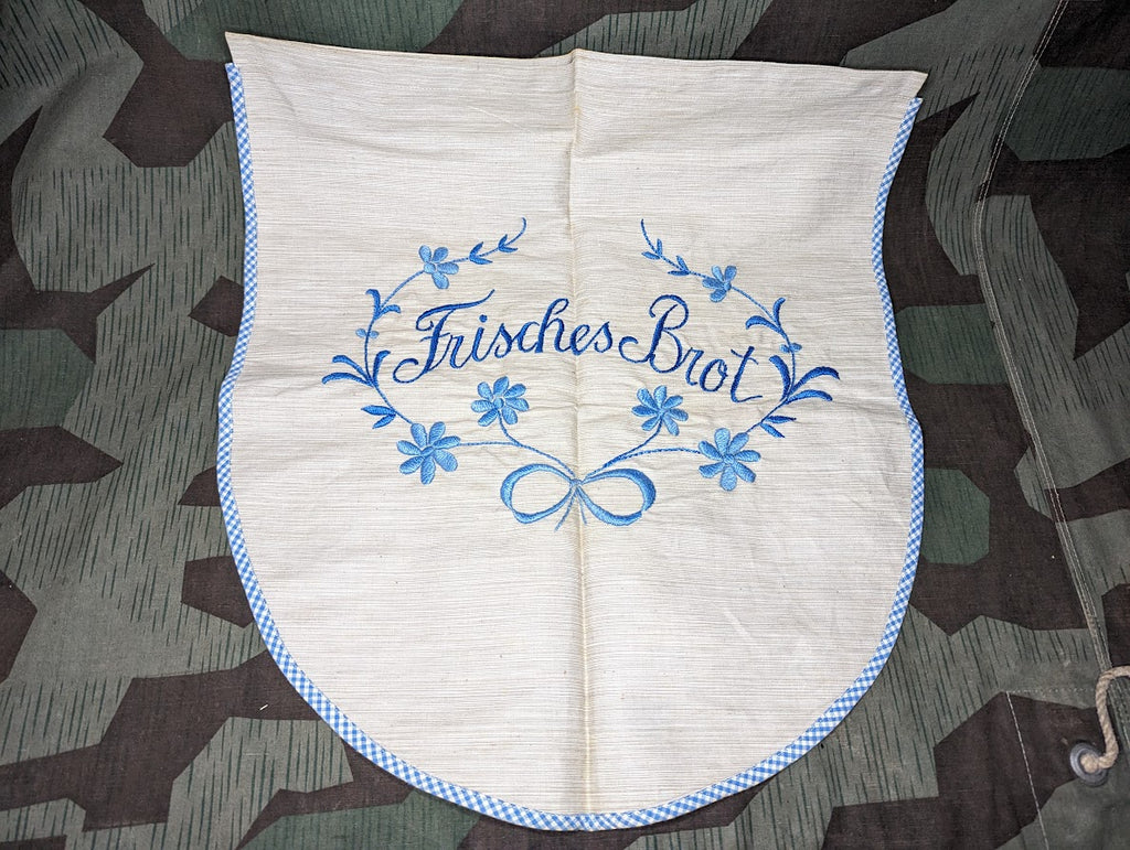 Vintage Frisches Brot ("Fresh Bread") embroidered bag. It is in good condition with a little storage dirt and discoloration. Has not been cleaned. Nice size bag to fit large loaves of round Bauernbrot. This one does not have a drawstring closure - either it was never meant to, or it is unfinished. - ← Previous Product Next Product →