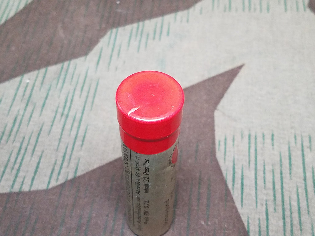Original sealed (empty display) Emser Pastillen aluminum pill tube. This is an original store display from the 1930's. Price is written in Reichsmarks. Really rare, neat piece in great condition. It measures about 3 5/8" long and less than 1" in diameter. - ← Previous Product Next Product →