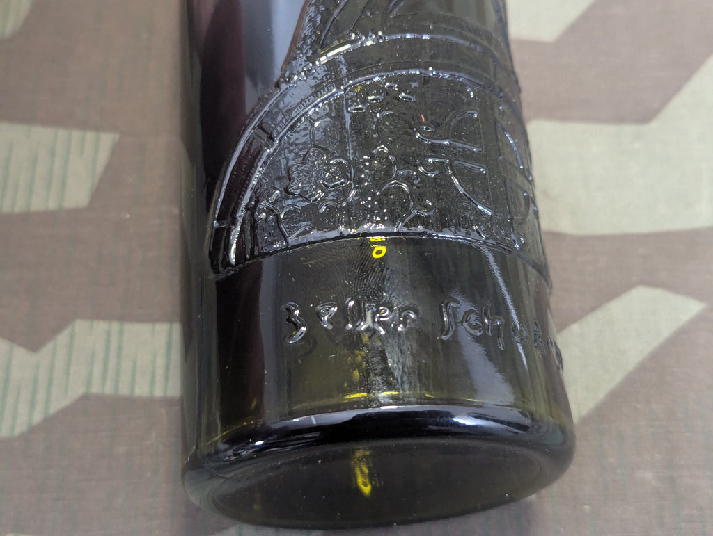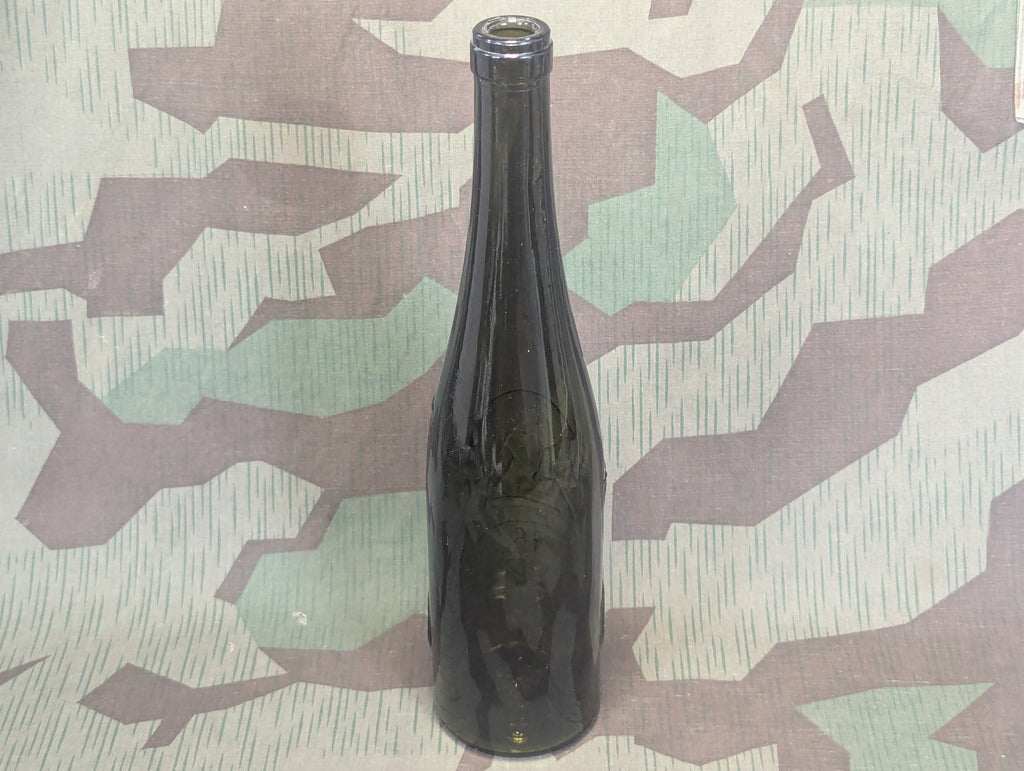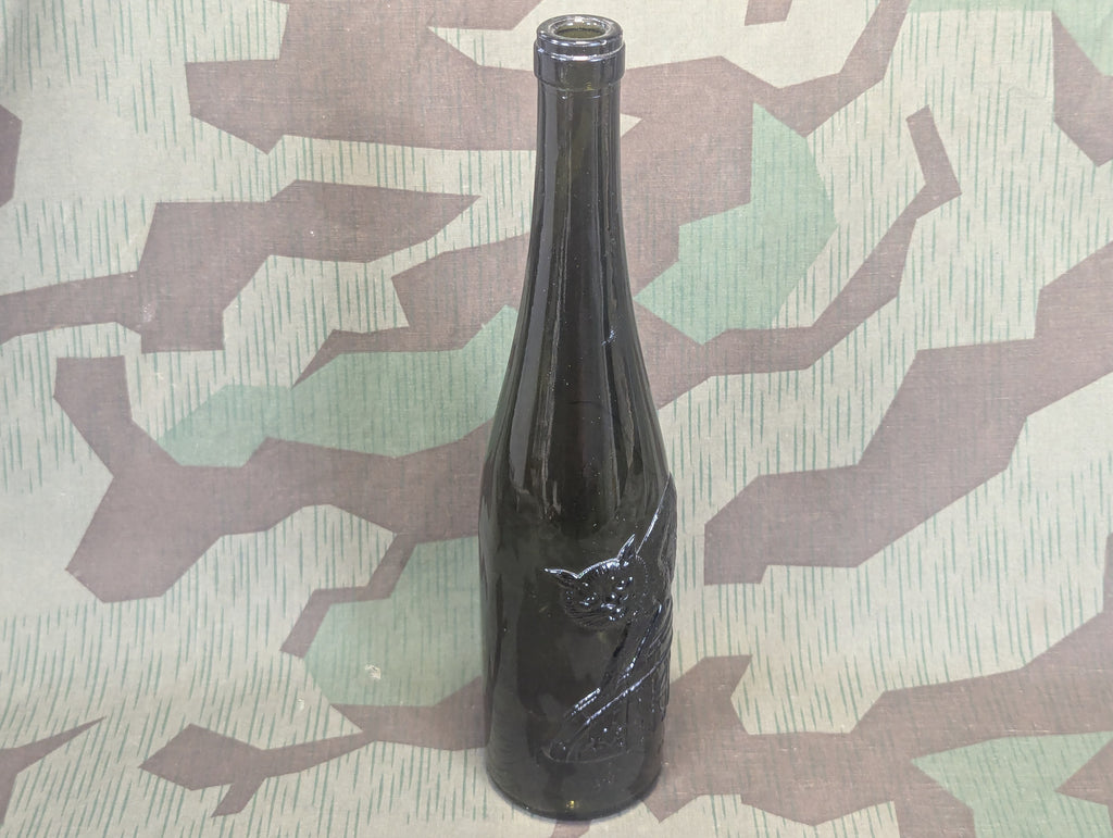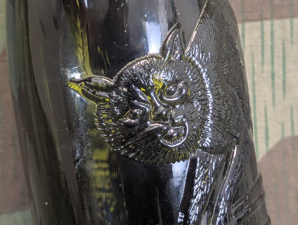 Beautiful embossed glass wine bottle for zeller schwarze katz. The style of the bottle and the way its made make me think it is likely war time roughly, it is similar to some bottles dated to the 1960's but this one is a little more intricate in design and seems older. It has a flat bottom which is an older style. Just look at the cats face, I really don't need to say anything more. This bottle sells itself.