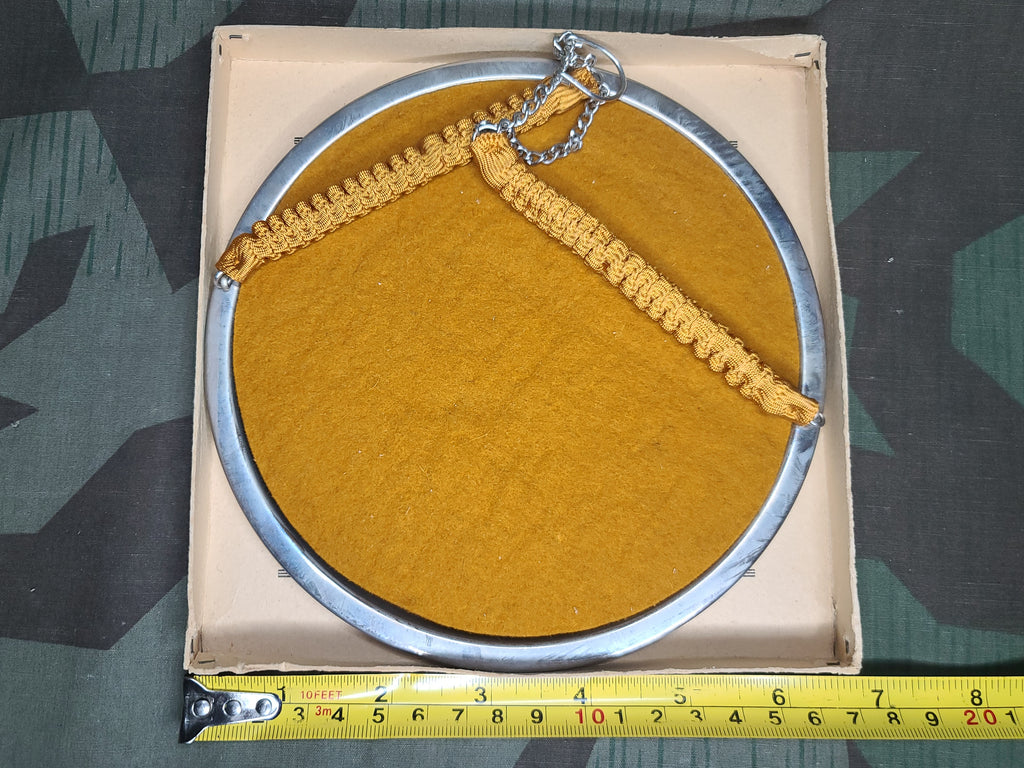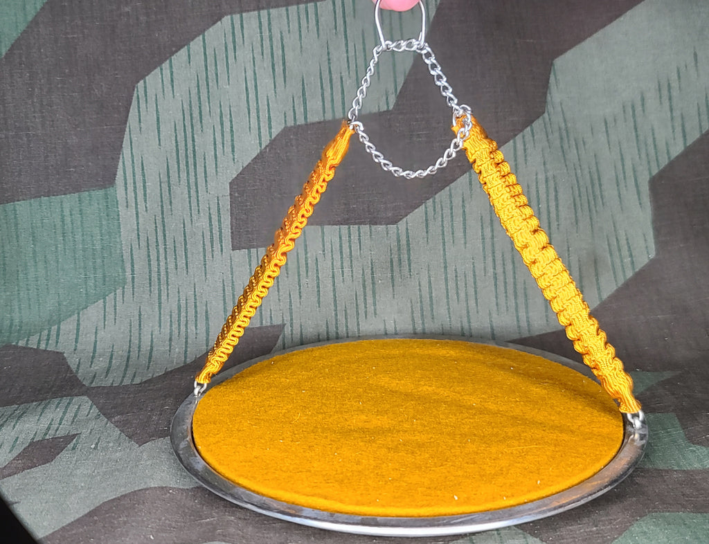 Original interesting coaster for teapots, wine bottles, and anything else that might drip on your counter. It is a metal tray with a yellow/gold color felt pad and a stretchy cloth covered chain strap to firmly hold the coaster on. Erista brand. The box is marked D.R.P. (Deutsches Reichspatent), but the coaster itself is not marked.