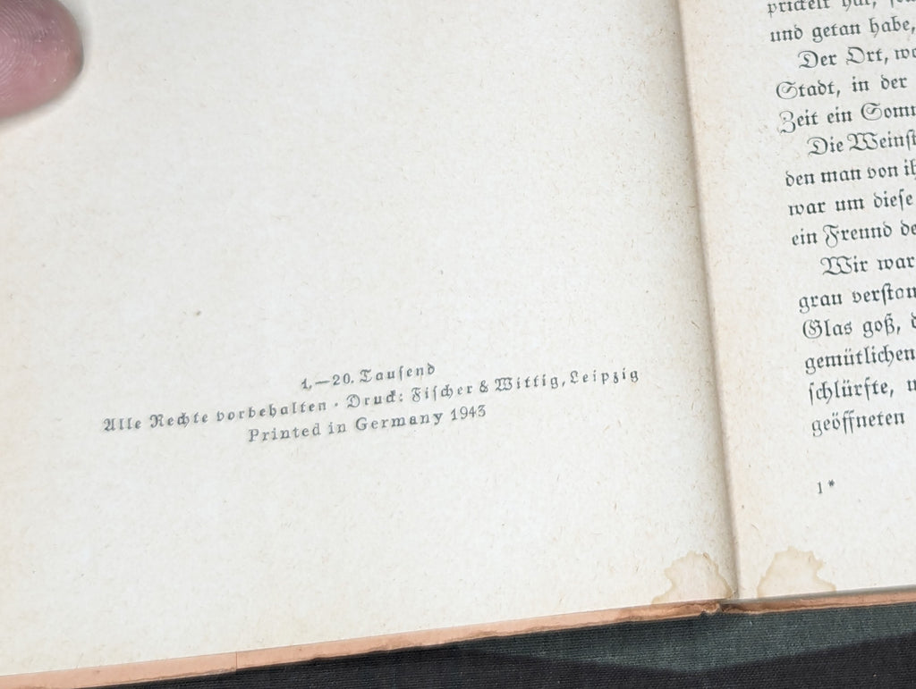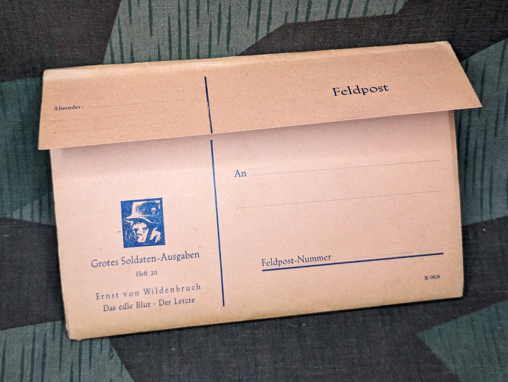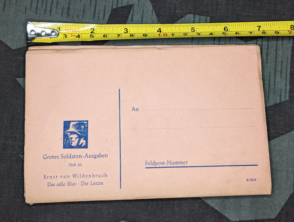 Original 1943 German feldpost ausgabe book designed to be sent directly through the mail. The cover doubles as an envelope/postcard. It is a double feature with two stories. The titles (Das Edle Blut - Der Letzte) roughly translate to "The pure blood - The last". Fairly good condition with some light wear and a little staining. - ← Previous Product Next Product →