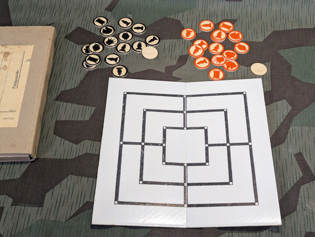 Original Feldpost soldiers game set. The back of the chess board is printed for the game Mühle (Nine Men's Morris). This set is complete and in fairly good condition. The box has some staining and dirt.