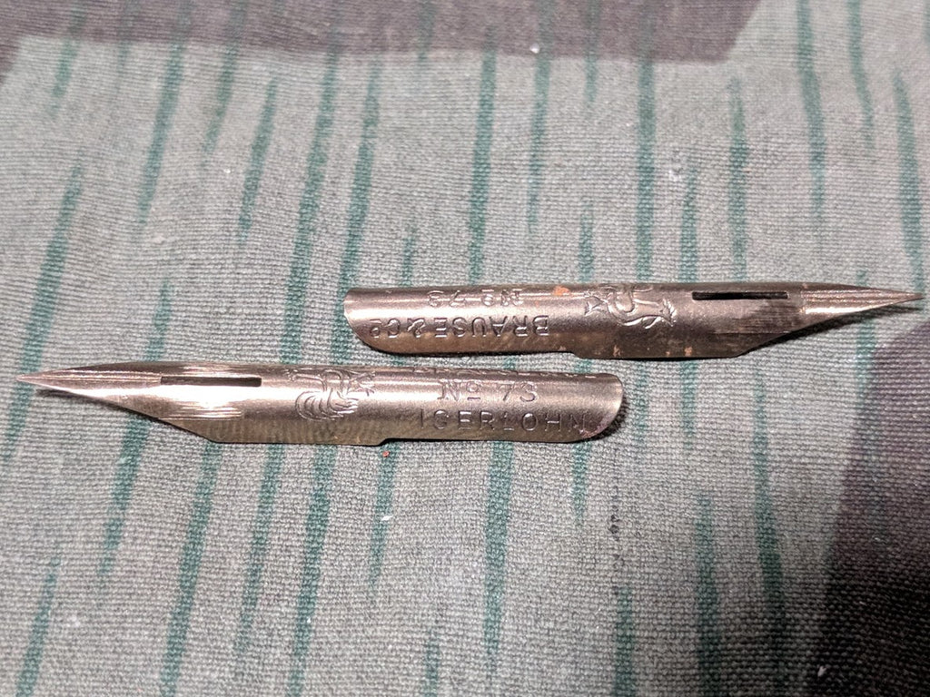 Pre-war box of Brause-Feder pen nibs. It originally contained a gros (144, or 12x12) of nibs but some may be missing. The box is in nice condition with minor wear and the pen nibs appear to be in good condition with the occasional spot of rust. You will be able to write for years now. The box measures just over 2 3/4" by 1 7/8" by 1". - ← Previous Product Next Product →