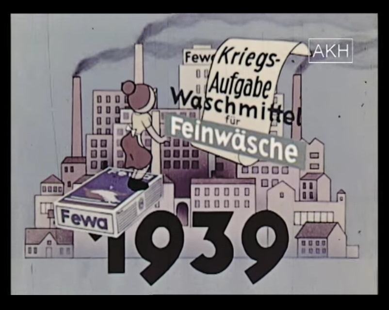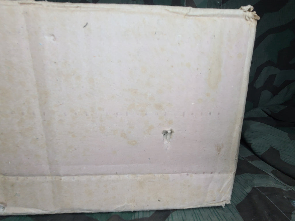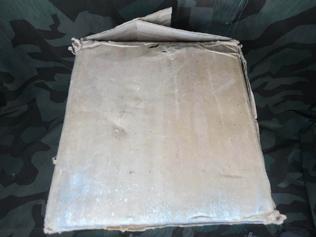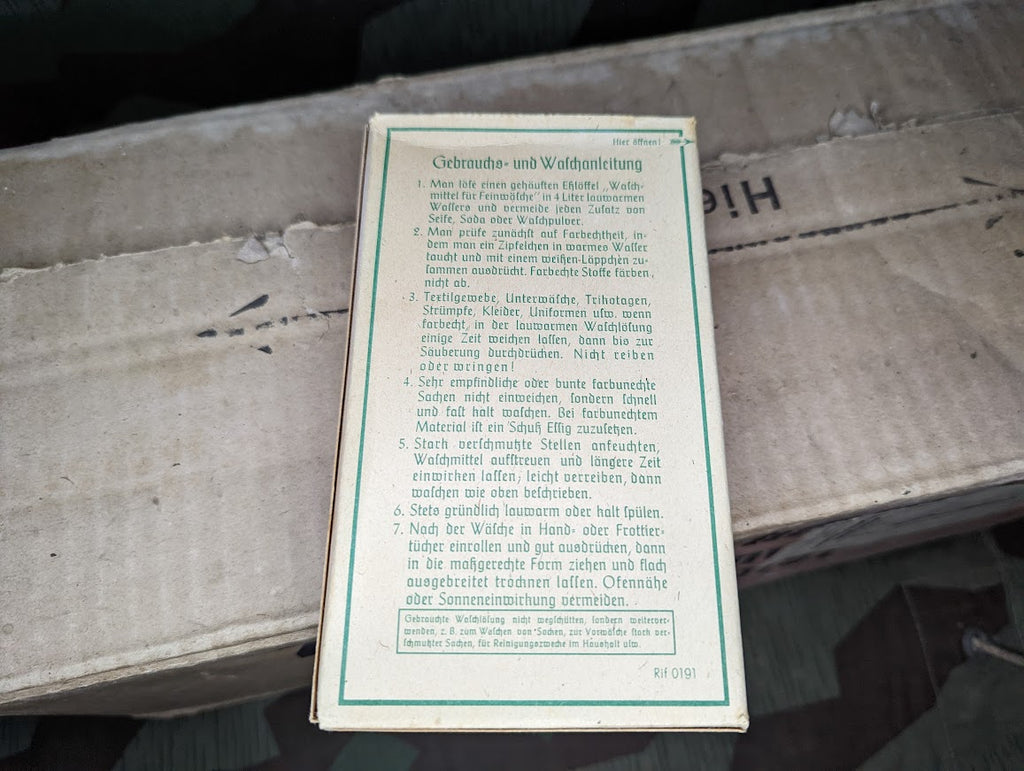 Original full case of Waschmittel uniform and other garment laundry soap. The main carton is in fairly good condition for being cardboard. The biggest flaw is some silver paint on the bottom (and a bit on the side). There are a few rips and small spots of damage, but the box is still holding up well. The internal soap boxes show some age, discoloration and general wear, but could be sellable on their own if you chose to break it up.