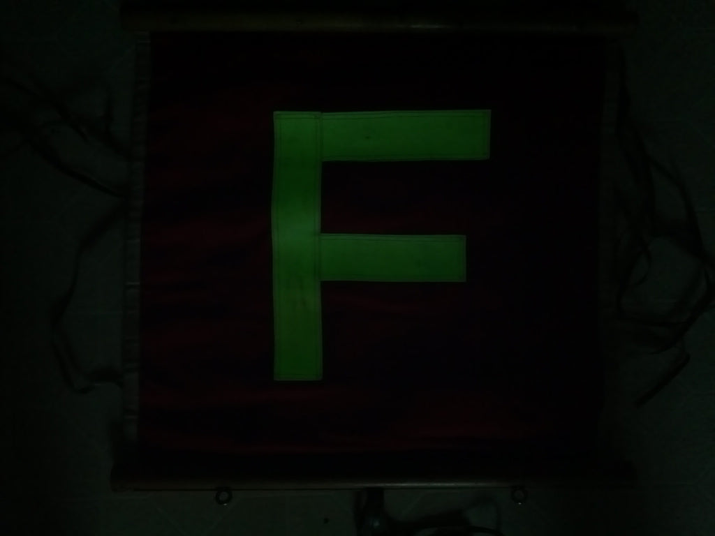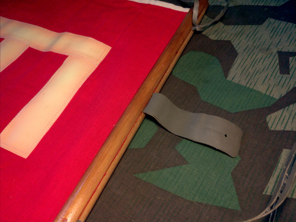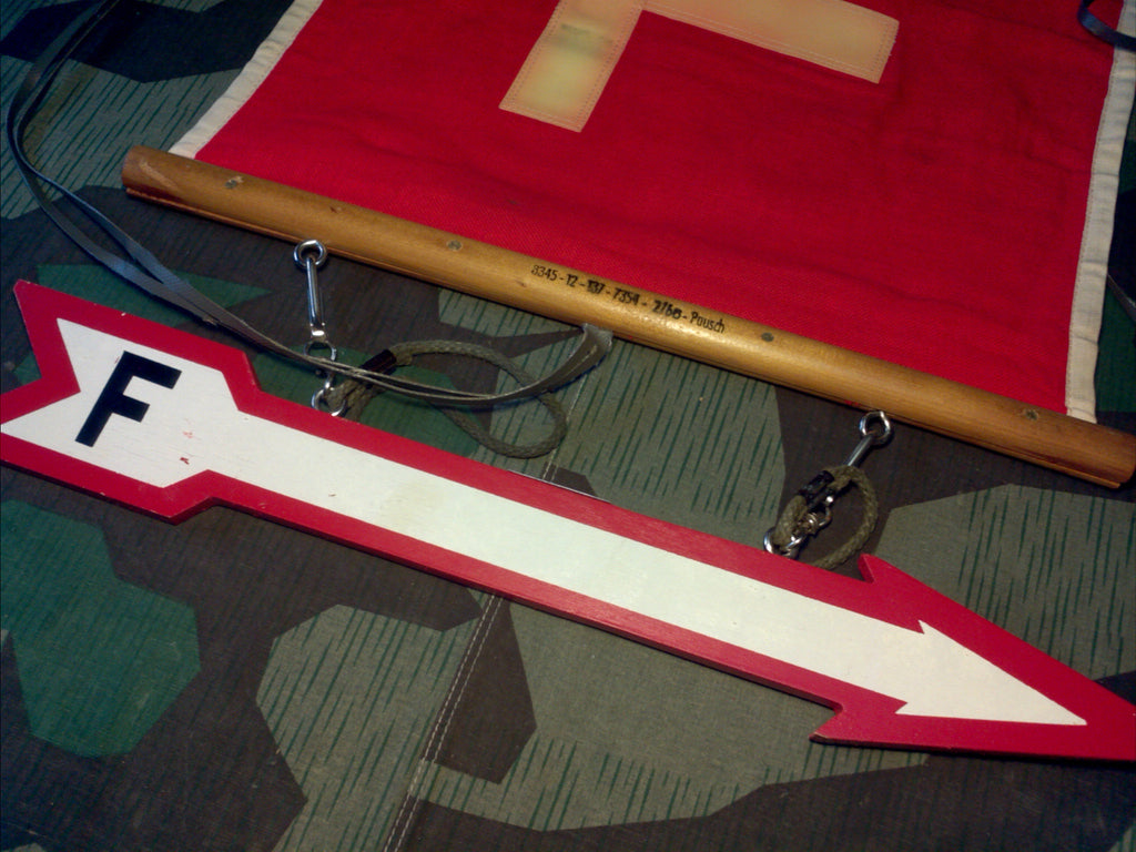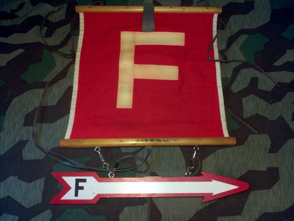 This is a post war Bundeswehr communications flag or sign. The arrow is removable and has its own rope hanger, in case you need to use it to help point to the Funkstelle. This is very similar to the WWII version. It is nearly the same construction - the straps would have likely been leather during the war rather than rubberized cloth, although that is not terribly distracting. The F on the flag is also made of a rubberized cloth and glows in the dark. It shows a bit of wear to the flag and the paint on the arrow - some of the flags need a bit of cleaning (the "F" has a bit of dirt on some). This is a nice accessory for a communications display. - ← Previous Product Next Product →