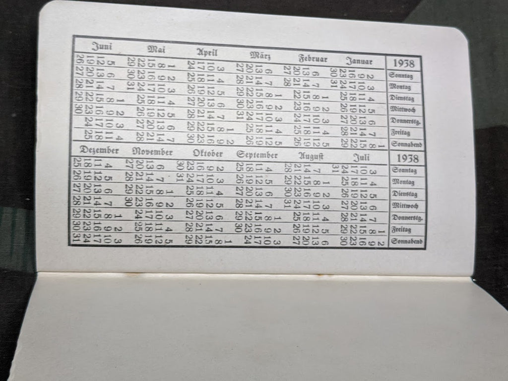 Original German notebook with "Notes" written on the front. Inside is lined pages and the back has a calendar for 1938. The staples are a bit rusty and there is storage wear / fading to the back cover. Otherwise good, unused condition. - ← Previous Product Next Product →