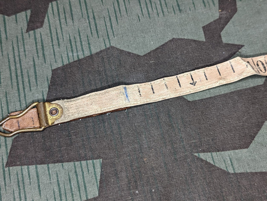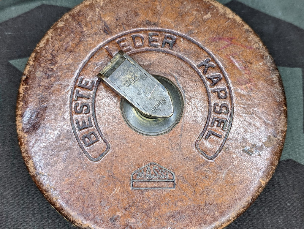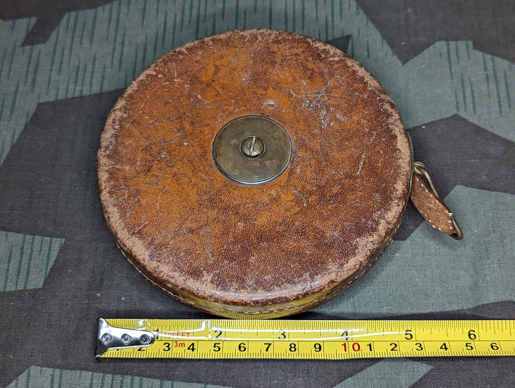 Nice example of a German 20 meter tape measure. Ideal for building bunkers and other fortifications. A smaller version of this was actually included on the hatchet carrier and I have had a few of these larger ones which were army marked. This one appears to just be civilian. It is in fairly good condition. The stitching on the leather at the very end of the cloth tape is coming loose. - ← Previous Product Next Product →
