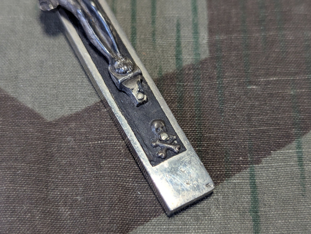 Period German Catholic large crucifix. This is a fairly sizable and weighty piece. It is the sort of cross you will see used by Wehrmacht chaplains and they are frequently sold as such. Maybe those people know something I don't, but I believe it is far more likely not for Wehrmacht chaplains specifically, but rather something a civilian item that a chaplain could use. Looking at original photos, there are a few varieties visible. It is also fairly classic in its construction and would easily fit in any time in WWI or WWII. Fairly good condition. No markings.