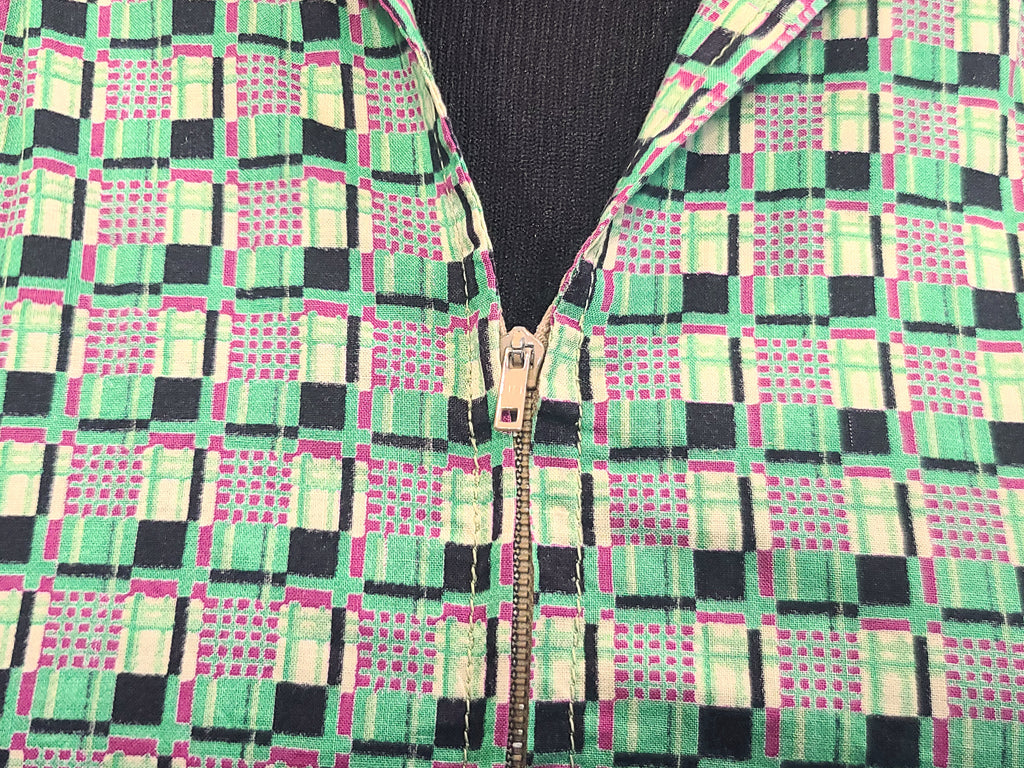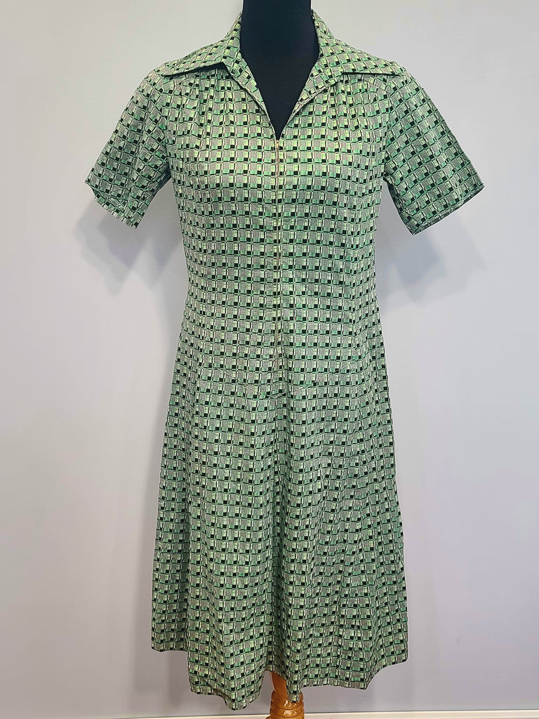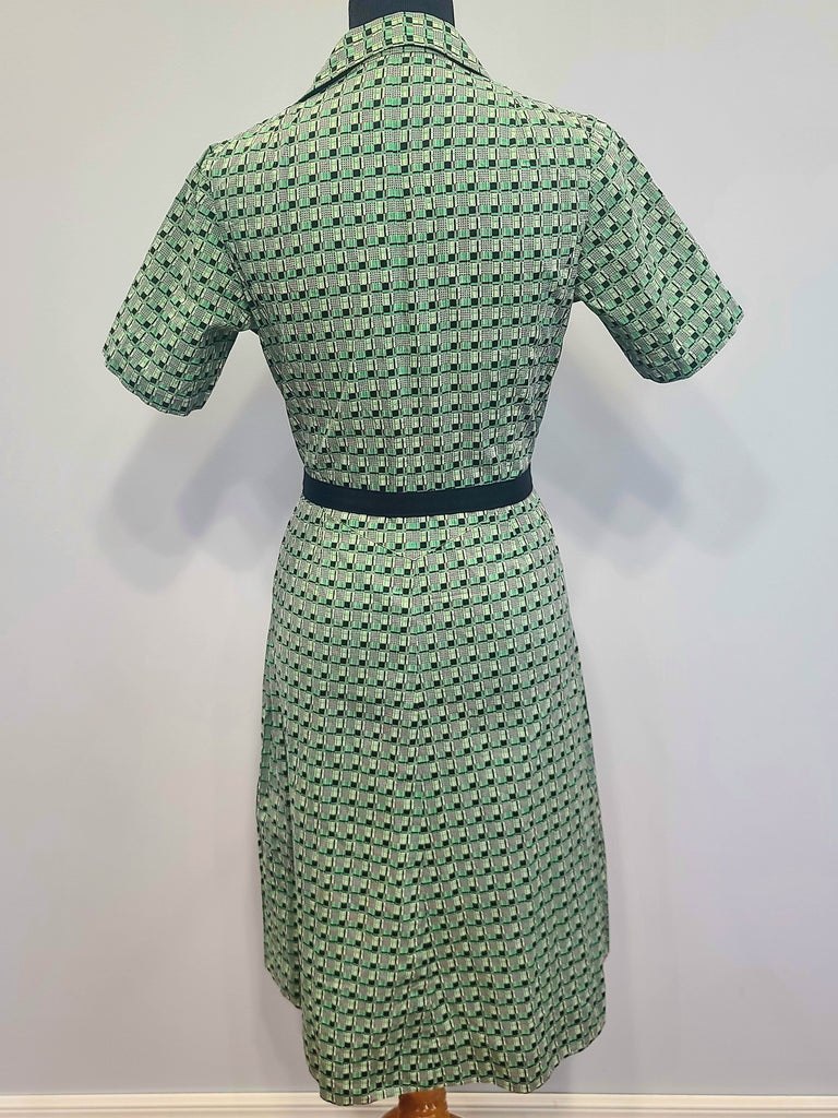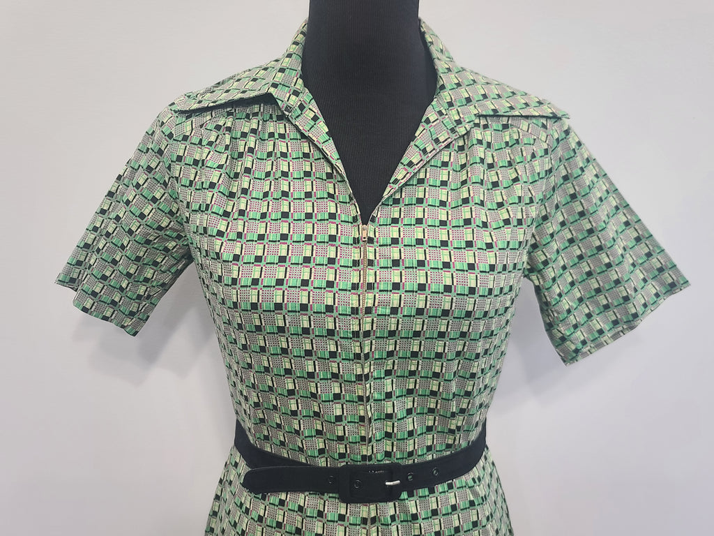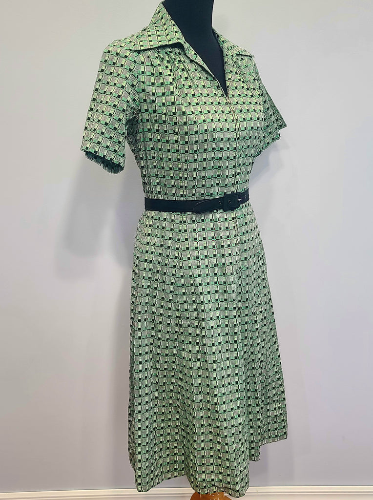 Length - 42"Nice zipper front cotton dress. It is handmade. The zipper is marked Riri. The black belt is included but is not original to the dress (it is a vintage 1940s belt that happened to be the same size and they pair together very nicely). Very good condition with only very light wear.