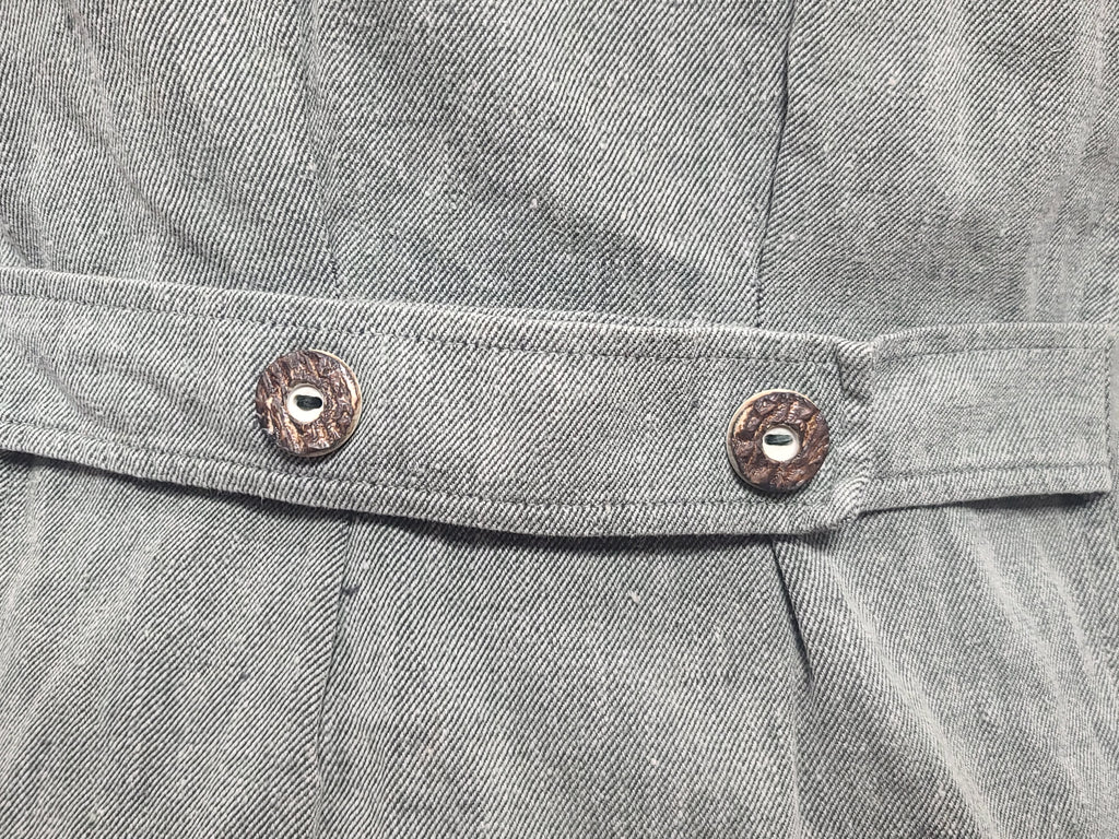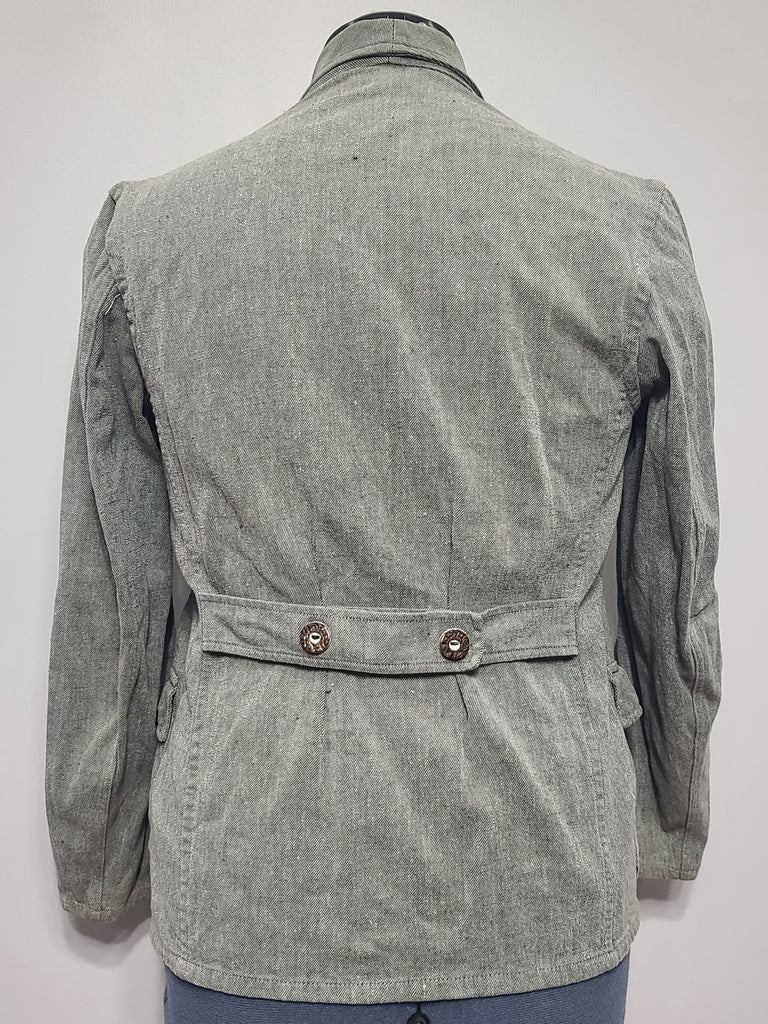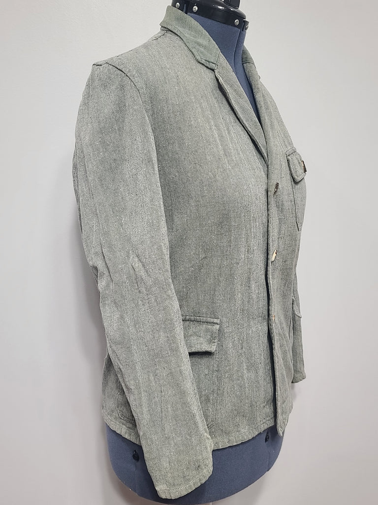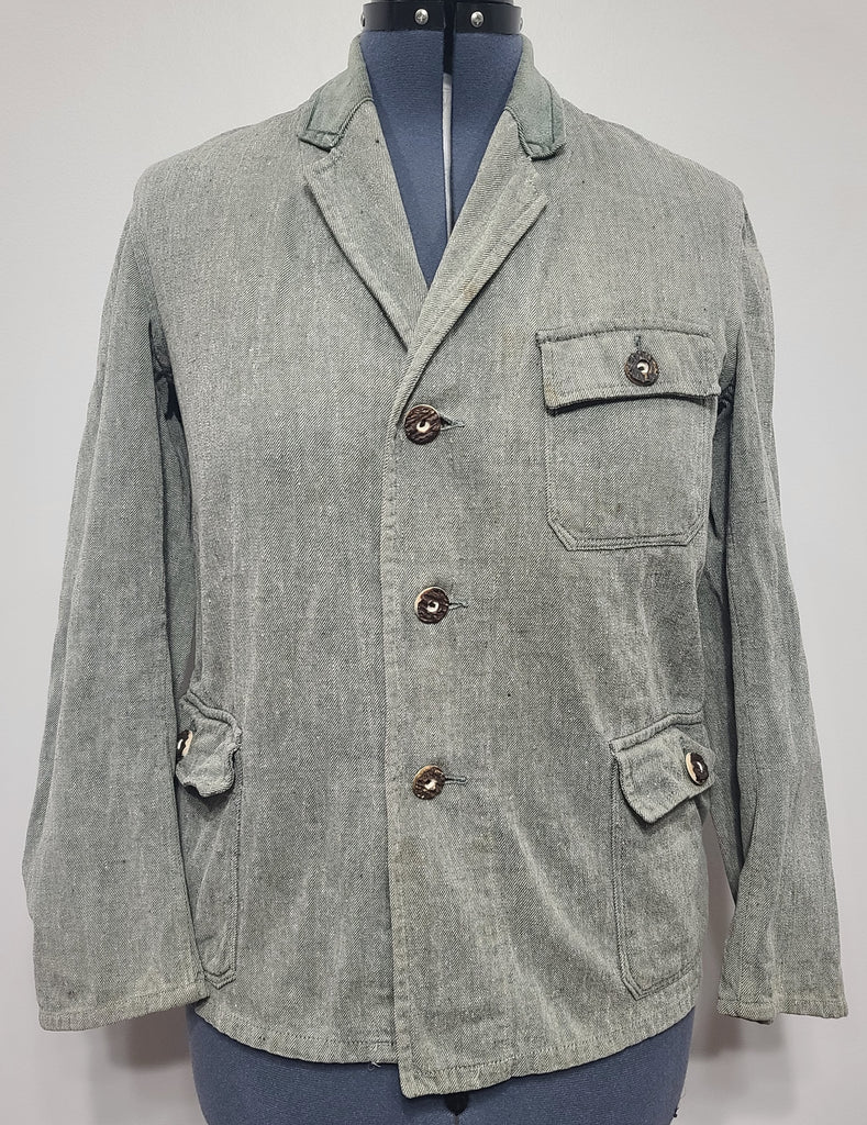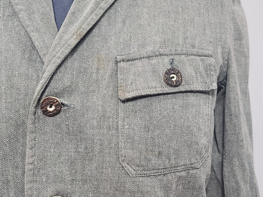 Vintage German hunting jacket with horn buttons. It does have some mild staining, but is otherwise fairly nice. The collar is a slightly different color, Its possible that it used to be much more pronounced, like other traditional style jackets, but has faded over time. Made from a fairly heavy weight two tone cotton twill. Ernst Fritsche Niederoderwitz / Sa. label. EU size 48.