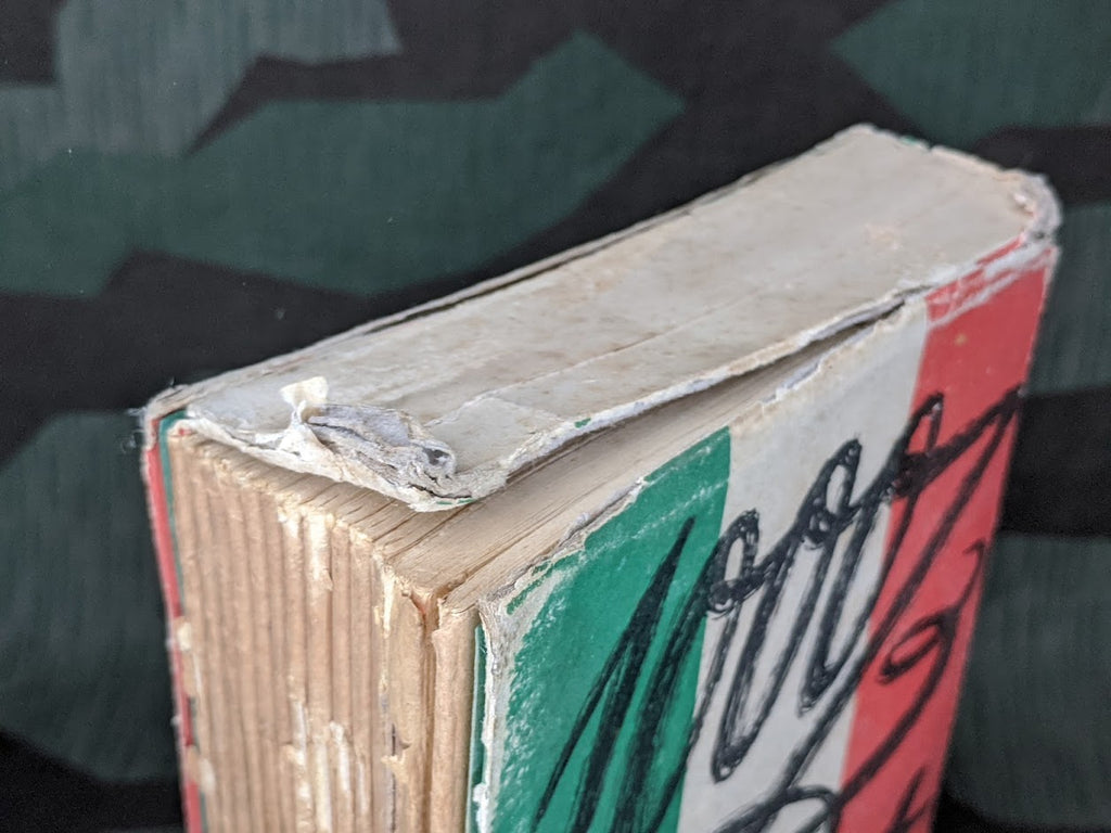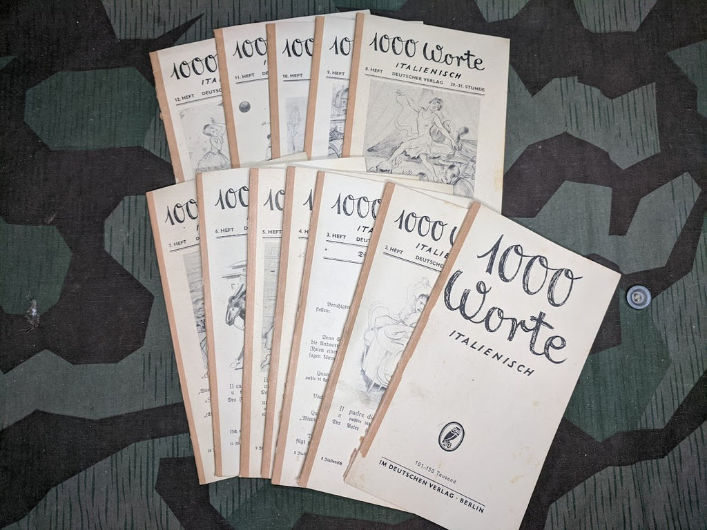 Set of books teaching Italian to Germans. 1000 Worte Italienisch (1000 Words in Italian). It is in OK condition. The outside cover box is badly torn. The books themselves have some age discoloration / staining, light wear and small tears. It contains references to the Italian army, so I am guessing it dates to the 1930s. I did not see a date.