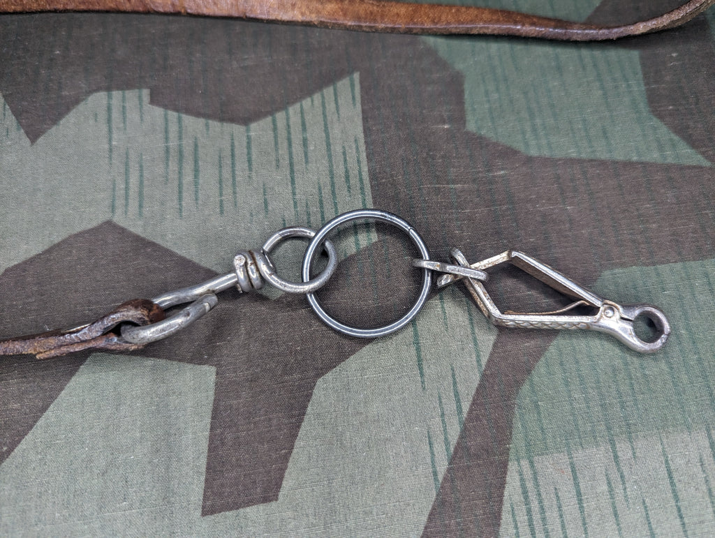 Period German leather dog leash. The leather is intact, but there is an area that looks a little stretched and stressed with some cracks forming. I wouldn't trust it to hold back a excitable medium or larger sized dog. - ← Previous Product Next Product →