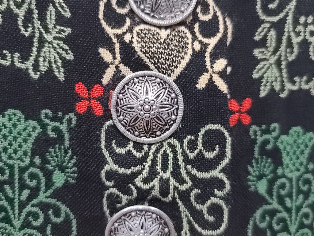 The dress is a heavier weight winter material. Snaps at the neck. Silver colored buttons with an early plastic backings. Side metal zipper. Snaps at the ends of the sleeves (some snaps are missing and some need resewn). Full skirt. Small hole in the front by the hem in the center. Has a bit of an attic smell.