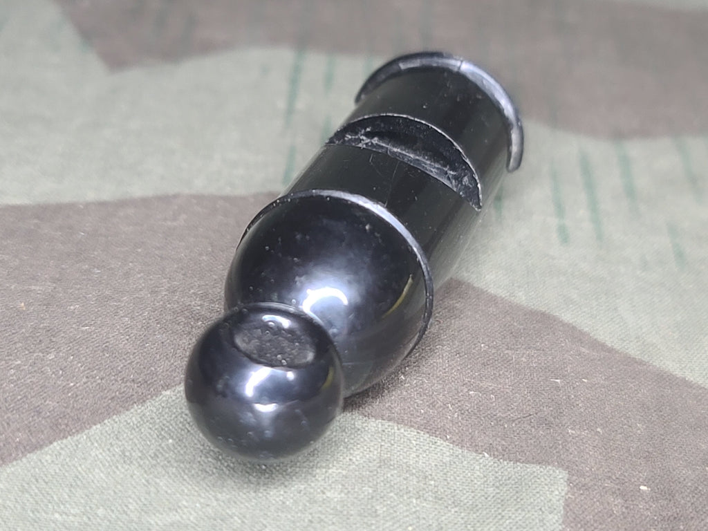 This is a German NCO's whistle in fairly good condition. This is the "text book" style whistle that collectors look for though many versions were used. This style of whistle has been produced for a very very long time in Germany and is still made today (although in modern materials). This one is post war as the black material might look a bit bakelite-like but it is a post war plastic.